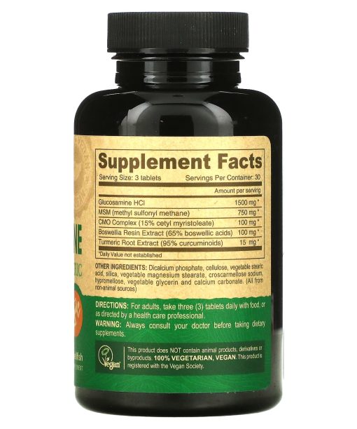 Non-ShellfishMade From Non-Animal Ingredients VeganDietary SupplementThis human body produces Glucosamine naturally, and it can be found in the fluid that is around the joints and some other parts of the body. Our Glucosamine supplement  is derived from non-GMO corn rather than shellfish or other animals.MSM is an efficient source of sulfur. CMO and, Boswellia herb extract are included as additional ingredients. CMO we use is derived from the kombo-nutmeg rather than the usual beef tallow.Vegan® – This product does not contain animal products, derivatives or byproducts. 100% Vegetarian, Vegan. This product is registered with the Vegan Society.