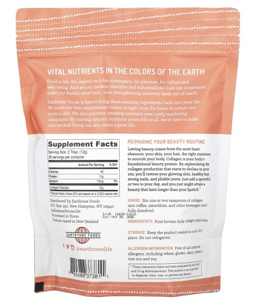The Essential Beauty Protein Pasture-Raised & Non-GMOReplenish Your Body’s Collagen Supply for Lasting Beauty and YouthfulnessVital Nutrients In The Colors Of The EarthFood is life. We depend on it for sustenance, for pleasure, for culture and wellbeing. And yet our modern lifestyles and industrialized food can sometimes make our Earth’s most basic, soul-strengthening nutrients seem out of reach.Earthtone Foods is here to bring those amazing ingredients back into your life. We know the best nourishment comes straight from the heart of nature, not science labs. We also prioritize amazing nutrition over costly marketing campaigns. By making nature’s nutrients accessible to all, we’re here to make sure modern living can also mean a great life.Reimagine Your Beauty RoutineLasting beauty comes from the most basic elements: your skin, your hair, the right nutrients to nourish your body. Collagen is your body’s foundational beauty protein. By replenishing the collagen production that starts to decline in your 20s, you’ll restore your glowing skin, healthy hair, strong nails, and pliable joints. Just add a spoonful or two to your day, and you just might attain a beauty that lasts longer than your lipstick.