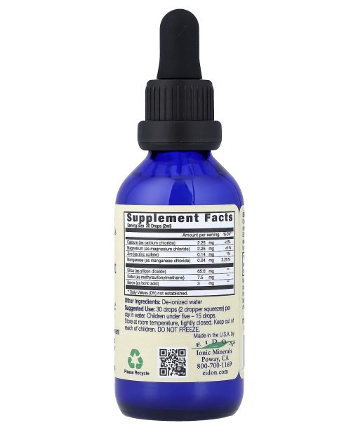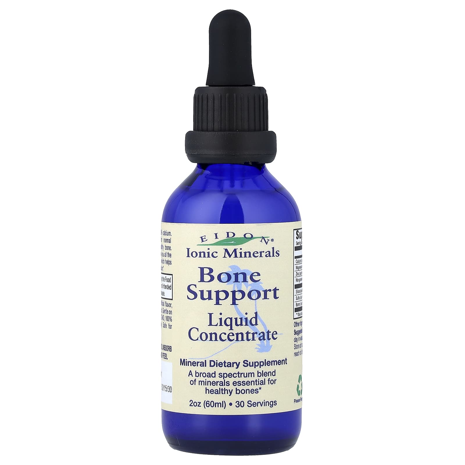 Mineral Dietary Supplement30 ServingsNaturally DerivedGentle On The StomachGluten-FreeVeganNon-GMO100% BioavailableIt’s Not What You Take, It’s What You Absorb Purity You Can See, Taste and FeelA broad spectrum blend of minerals essential for healthy bones. Eidon Bone Support: Bone is only 20% calcium. Other minerals are also required for normal development and maintenance of healthy bone. Eidon Bone Support is formulated to give you all the essential bone nutrients, including silica which helps form the collagen matrix and manage calcium.