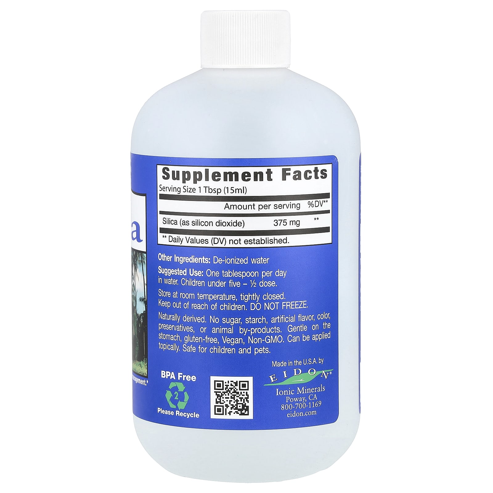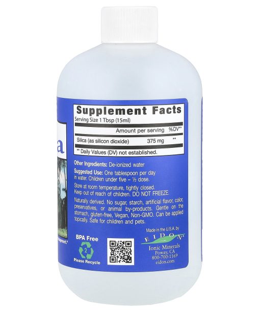 Silica is Involved in Collagen Formation and Calcium ManagementMineral Dietary SupplementPurity You Can See, Taste and FeelBPA FreeEidon Silica: Today most diets are severely lacking in silica due to over refinement of grains. Silica has been shown to be essential for proper storage of calcium and for maintaining healthy connective tissue – a key component of cardiovascular, gastrointestinal, joint and bone tissues. Silica may be applied topically to soothe the skin.The Eidon Difference: No more guess work, Eidon uses a proprietary process that transforms pure mineral crystals into a fully hydrated, 100% bioavailable liquid ionic supplement. Large doses used in solid supplements are not completely absorbed. It is not necessary to take large doses in order to be effective.It’s Not What You Take, It’s What You AbsorbGentle on the stomach, gluten-free, vegan, non-gmo. Can be applied topically. Safe for children and pets.