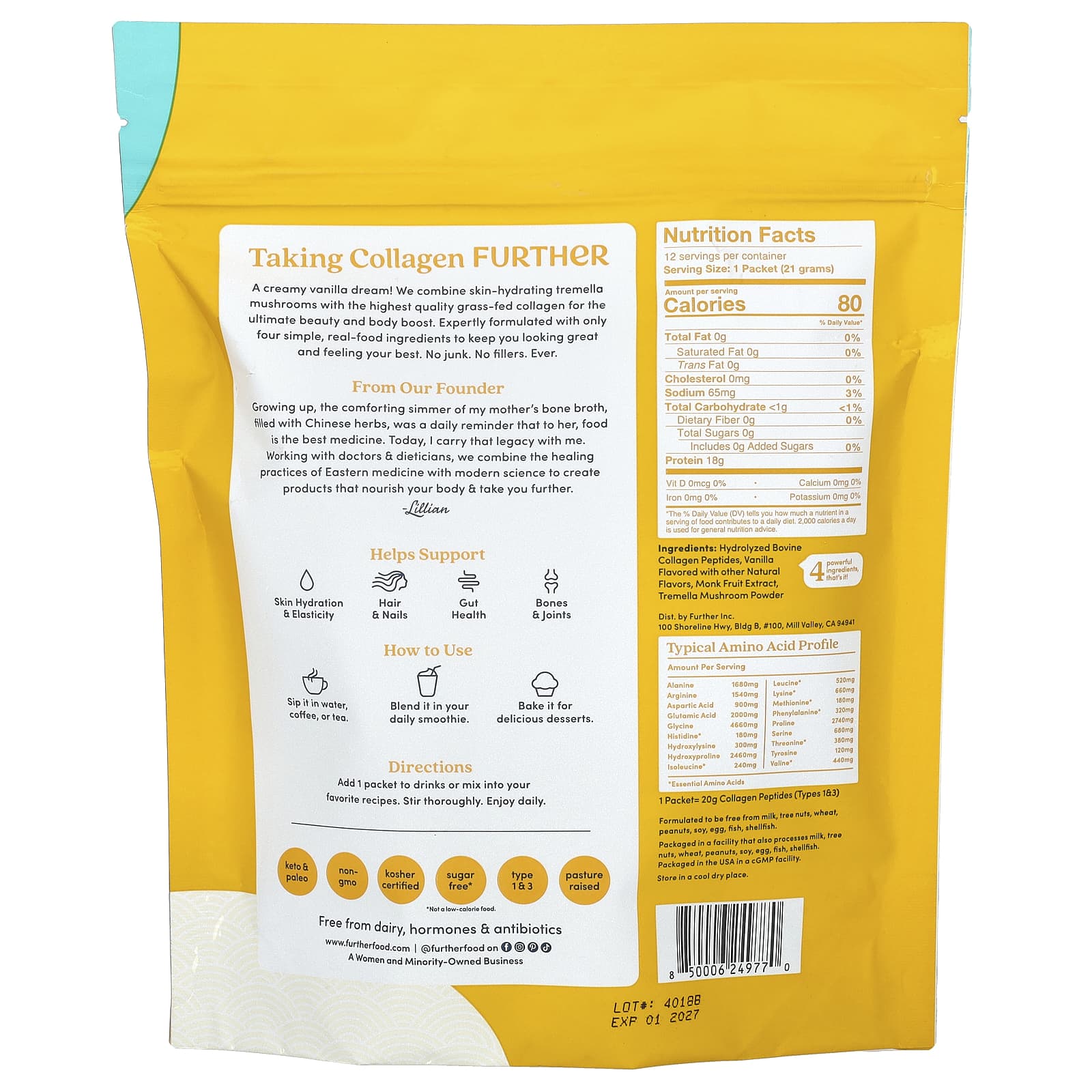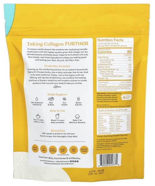 20 g Collagen Per PacketOn-The-Go Packets Flavored With Other Natural FlavorsSkin, Hair, NailsGut & Joint SupportKeto & Paleo Non-GMOKosher Certified Sugar Free*Type 1 & 3Pasture RaisedFree From Dairy, Hormones & AntibioticsA Women And Minority-Owned  Business4 Powerful Ingredients, That’s It!Taking Collagen FurtherA creamy vanilla dream! We combine skin-hydrating tremella mushrooms with the highest quality grass-fed collagen for the ultimate beauty and body boost. Expertly formulated with only four simple, real-food ingredients to keep you looking great and feeling your best. No junk. No fillers. Ever.From Our Founder Growing up, the comforting simmer of my mother’s bone broth, filled with Chinese herbs, was a daily reminder that to her, food is the best medicine. Today, I carry that legacy with me. Working with doctors & dietitians, we combine the healing practices of Eastern medicine with modern science to create products that nourish your body & take you further.-LillianHelps SupportSkin Hydration & ElasticityHair & Nails Gut HealthBones & Joints*Not a low-calorie food.