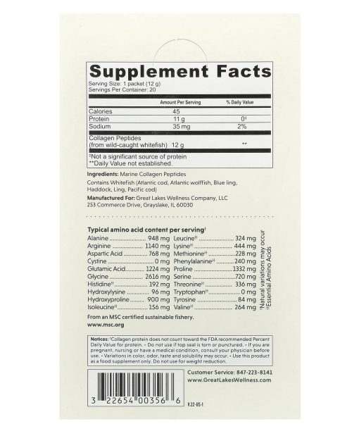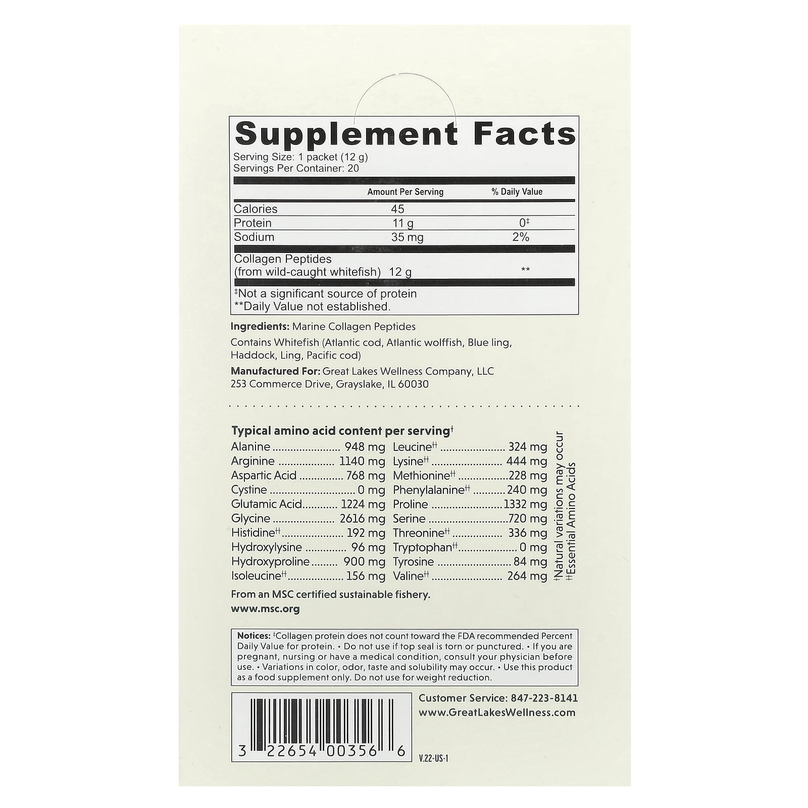 Great Lakes Wellness, Quick Dissolve Collagen Peptides, Daily Marine, Unflavored, 20 Packets, 0.42 oz (12 g) Each