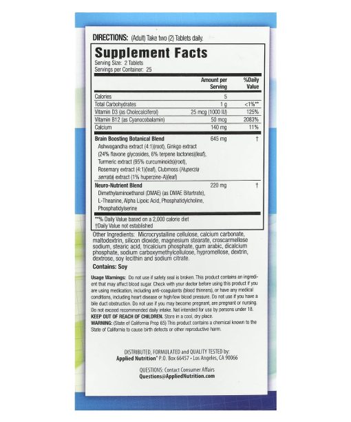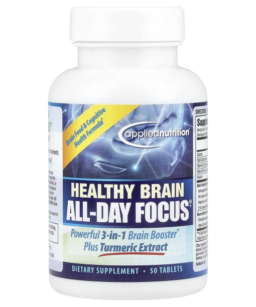 Brain Food & Cognitive Health Formula Dietary SupplementPowerful 3-in-1 Brain Booster Plus Turmeric ExtractBrain Boost 1: Attention & ConcentrationBrain Boost 2: Memory & Mental ClarityBrain Boost 3: Calm & FocusHealthy Brain All-Day Focus®Healthy Brain All-Day Focus® is unlike any product on the market. This unique combination of brain-boosting nutrients is specially formulated to deliver benefits in three areas:Brain Booster 1: sharpens your mind for enhanced focus and concentration.Brain Booster 2: promotes memory and information retention, while supplying powerful antioxidant compounds to help keep you at your best during all stages of life.Brain Booster 3: supports healthy brain chemistry and calms the mind for enhanced focus.Try this advanced cognitive support formula for 25 days and see how you feel. We’re confident that you’ll notice the difference. Continue taking this product for three months or more for maximum results.Applied Nutrition® is committed to developing science-based products that exceed the highest standards for quality and purity. As a leader in innovations, we contentiously strive to bring forth new ideas and groundbreaking formulas that enhance health and well-being.Are you ready to see results?This comprehensive formula combines powerful brain nutrients into 1 bottle…and delivers results in just 2 pills per day!Vitamin D3 and Vitamin B12 are essential nutrients that support healthy brain function.Ginkgo extract supports circulation to the brain, enhances memory and supplies powerful brain antioxidant compounds.L-Theanine is a calming nutrient found in green tea that promotes a state of “alert relaxation,” thereby supporting focus and concentration.Turmeric and Alpha Lipoic Acid help to protect the central nervous system against free radical damage.Ashwagandha is traditionally used to combat the negative effects of stress on the mind and to enhance memory. Phosphatidylserine and Phosphatidylcholine are important building blocks for healthy cell membranes in the brain.DMAE and Huperzine-A may help to support acetylcholine (a key brain chemical that plays a role in memory).