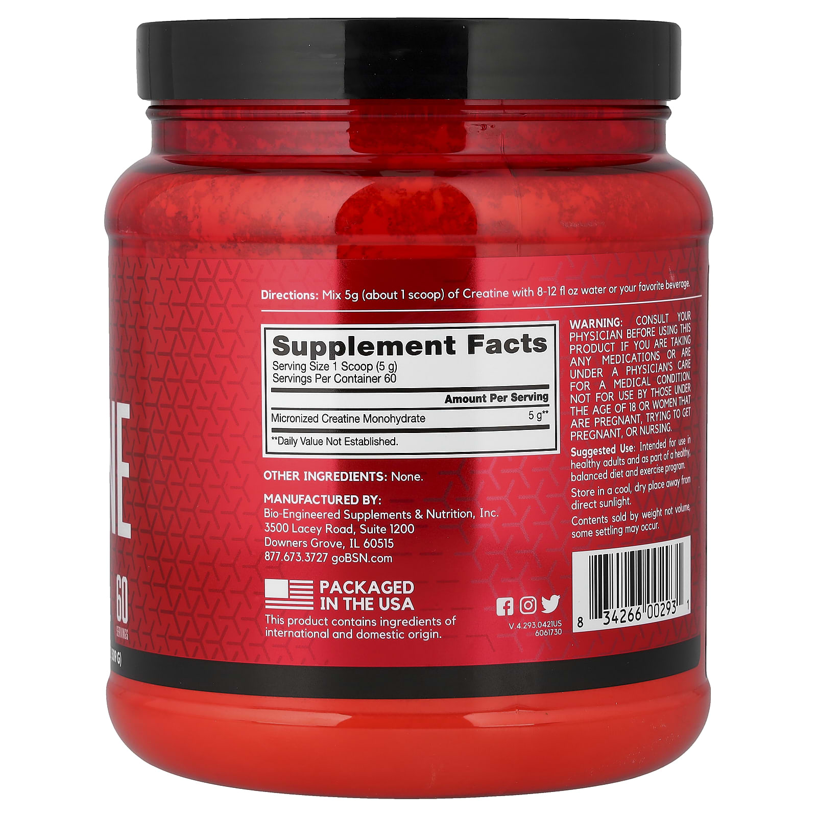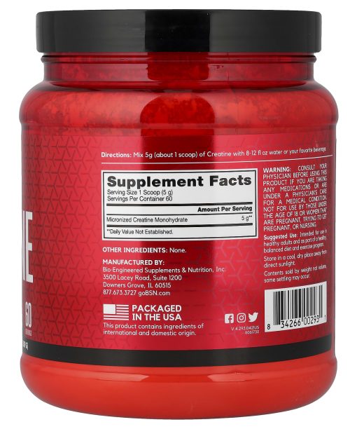 Unflavored for Stacking5 g Creatine MonohydrateMuscle StrengthDietary SupplementAchieving the ideal physique is what every athlete strives for. Why do you spend so much time working towards this goal? You do it for the looks, the respect and the confidence that comes from looking and feeling your best. BSN® Creatine helps you get there with 5 grams of 100% Creatine Monohydrate. One serving supports strength, power, and lean body mass to help you look your best in the gym, on the field, or simply anywhere. Your results are going to get noticed.BSN® Creatine when used as directed, over time, combined with a healthy diet and regular exercise is designed to support:MuscleStrengthRecoveryPerformanceCreatine is naturally occurring in foods like red meat. Supplementing with Creatine Monohydrate can help replenish your creatine stores. Which can help support muscle ATP recycling during high-intensity exercise. BSN® Creatine provides 5 grams of pure micronized Creatine Monohydrate to support strength, power, and muscle building without any fillers or additives*. With unflavored versatility, BSN® Creatine may be added to your post-workout recovery shake or favorite beverage.*When taken over time along with regular resistance exercise.