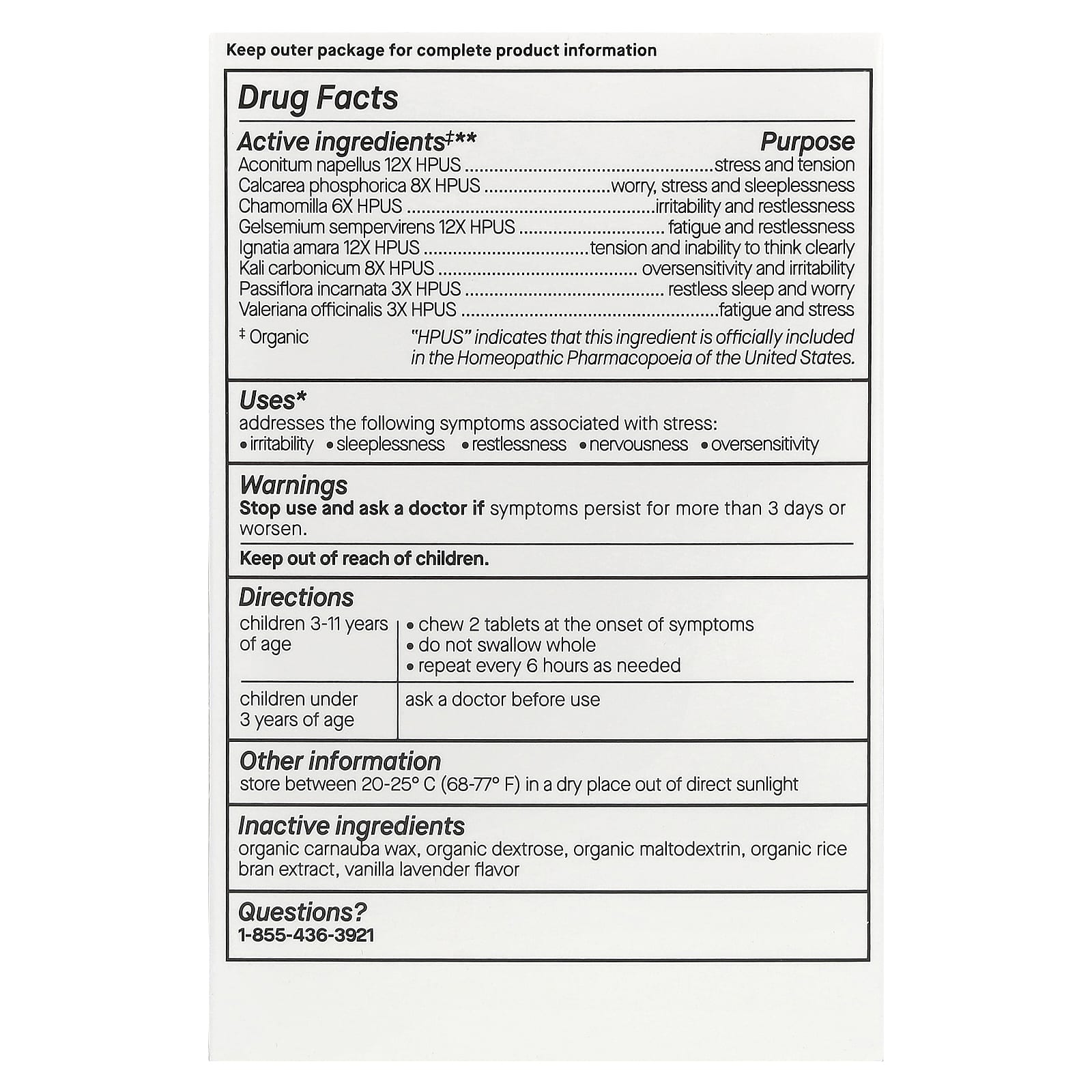 Drug FactsActive ingredients‡**PurposesAconitum napellus 12X HPUSstress and tensionCalcarea phosphorica 8X HPUSworry, stress and sleeplessnessChamomilla 6X HPUSirritability and restlessnessGelsemium sempervirens 12X HPUSfatigue and restlessnessIgnatia amara 12X HPUStension and inability to think clearlyKali carbonicum 8X HPUSoversensitivity and irritabilityPassiflora incarnata 3X HPUSrestless sleep and worryValeriana officinalis 3X HPUSfatigue and stress”HPUS” indicates that this ingredient is officially included in the Homeopathic Pharmacopoeia of the United States.‡Organic**X is a homeopathic dilution.Inactive Ingredients: Organic carnauba wax, organic dextrose, organic maltodextrin, organic rice bran extract, vanilla lavender flavor.