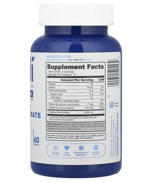 Zero Sugar and Still Delicious!Creatine (5 g Per Serving)PerformanceStrengthRecoveryScience-Backed IngredientsDietary SupplementKosher PareveNo Sugar AlcoholsKeto FriendlyScience-Backed IngredientsPhysician OwnedCertified B CorporationElevate your performance with Goli® Creatine Monohydrate Gummies, now with Zero Sugar, Vitamin B6 and B12. Each serving delivers 5g of creatine to promote muscle strength with exercise, lean muscle growth, and supports cellular energy production. Make Goli® Creatine Monohydrate Gummies your gym companion and stay Goli® strong every step of the way! Goli® Nutrition is an inventive, people-focused nutrition company driven by the belief that happiness and wellness go hand in hand. We strive to provide innovative products, uniquely formulated with complementary ingredients all backed by science, in a delivery format that makes taking your daily supplements enjoyable. We are proud that Goli® Creatine Monohydrate gummies are Gluten-Free, Non-GMO, Gelatin-Free and Vegan. Health Simple.