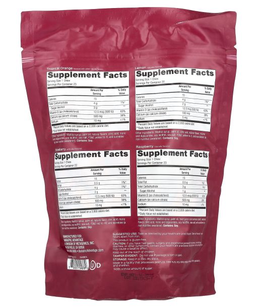500 mg Calcium500 IU Vitamin D3Dietary SupplementIndividually WrappedKosher DairyThis Product is Gluten FreeAssorted Fruit FlavorsStrawberryArtificially flavoredLemonNaturally flavoredRaspberryNaturally flavoredTropical OrangeFlavored with other natural flavorBariatric Advantage Calcium Citrate Chewy Bite 500 mg is specially formulated for bariatric patients, utilizing 500 mg calcium from only calcium citrate and delivering 500 IU of vitamin D3 to support calcium absorption.