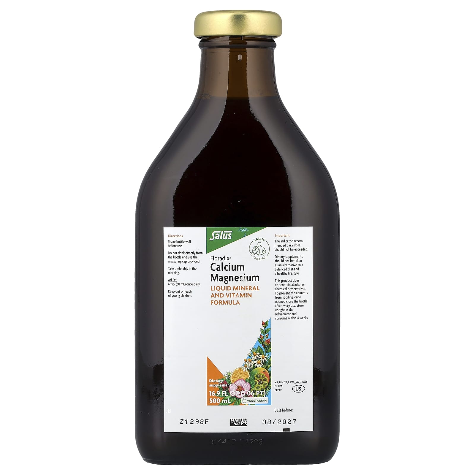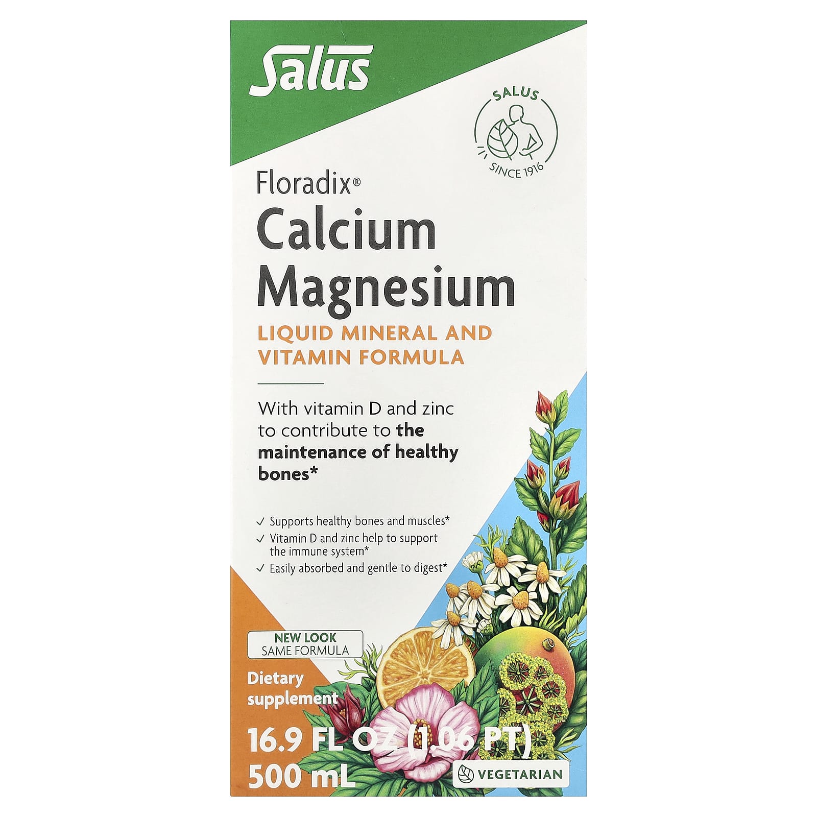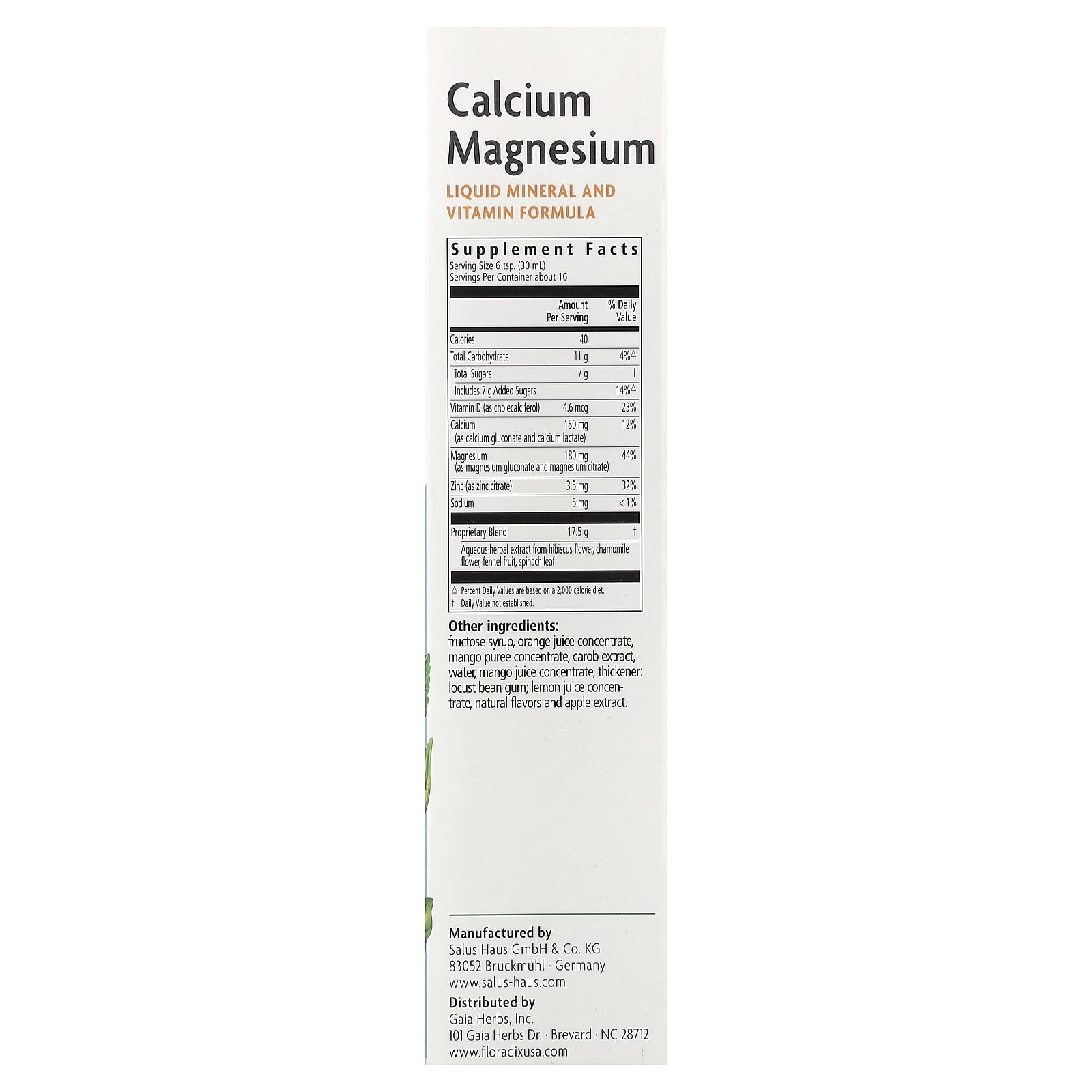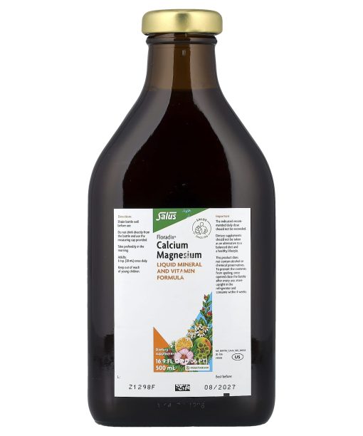 Since 1916Liquid Mineral and Vitamin FormulaSupports Healthy Bones and MusclesVitamin D and Zinc Helps to Support the Immune SystemEasily Absorbed and Gentle to DigestDietary SupplementVegetarianNo AlcoholNo PreservativesNo ColoringsGluten FreeWith vitamin D and zinc to contribute to the maintenance of healthy bones.Calcium, magnesium, vitamin D and zinc contribute to the maintenance of normal bones.Calcium, magnesium and vitamin D also contribute to the maintenance of normal muscle function and teeth. Furthermore, vitamin D supports the calcium absorption.Floradix Calcium Magnesium is easy to take and helps safeguard the balance of calcium, magnesium, zinc and vitamin D. As these nutrients are already dissolved, they are absorbed more quickly by the digestive system compared to tablets. Floradix Calcium Magnesium contains selected herbs and several fruit juice concentrates for a pleasant taste. Floradix Calcium Magnesium is particularly beneficial for women, adolescents, the elderly, sportsmen and -women and for people lacking these nutrients in their diet. About Salus Since the foundation of Salus Haus in 1916, the utmost importance has been placed on the careful selection of ingredients for our products. At Salus we do not use genetically modified raw materials. We combine nature with innovation and quality, developing new products with the use of state-of- the-art analytical methods in our laboratories. Salus applies the highest quality standards in Europe by carefully controlling the production of raw materials and finished products.