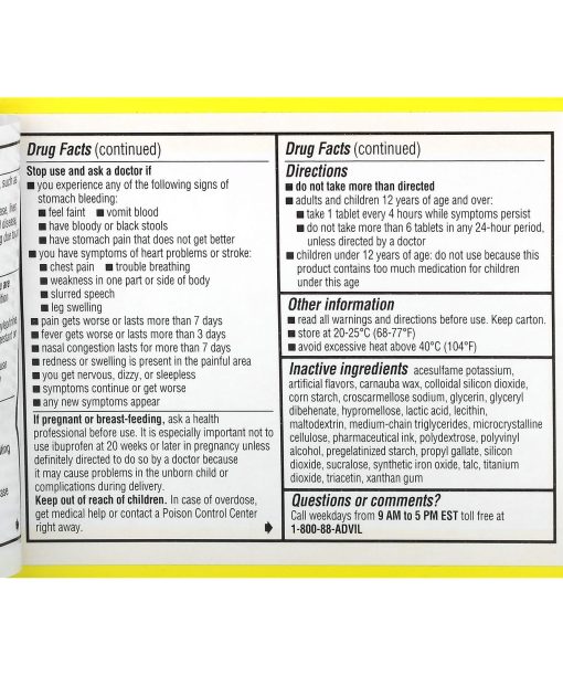 Do not use if plastic blister or foil barrier is broken.Allergy alert: Ibuprofen may cause a severe allergic reaction, especially in people allergic to aspirin.Symptoms may include:hivesfacial swellingasthma (wheezing)shockskin reddeningrashblistersIf an allergic reaction occurs, stop use and seek medical help right away.Stomach bleeding warning: This product contains an NSAID, which may cause severe stomach bleeding.The chance is higher if you:are age 60 or olderhave had stomach ulcers or bleeding problemstake a blood thinning (anticoagulant) or steroid drugtake other drugs containing prescription or nonprescription NSAIDs [aspirin, ibuprofen, naproxen, or others]have 3 or more alcoholic drinks every day while using this producttake more or for a longer time than directedHeart attack and stroke warning: NSAIDs, except aspirin, increase the risk of heart attack, heart failure, and stroke. These can be fatal. The risk is higher if you use more than directed or for longer than directed.Do not usein children under 12 years of age because this product contains too much medication for children under this ageif you have ever had an allergic reaction to any other pain reliever/fever reducerright before or after heart surgery if you are now taking a prescription monoamine oxidase inhibitor (MAOI) (certain drugs for depression, psychiatric, or emotional conditions, or Parkinson’s disease), or for 2 weeks after stopping the MAOI drug. If you do not know if your prescription drug contains an MAOI, ask a doctor or pharmacist before taking this product.Ask a doctor before use ifyou have a breathing problem such as emphysema or chronic bronchitisstomach bleeding warning applies to youyou have problems or serious side effects from