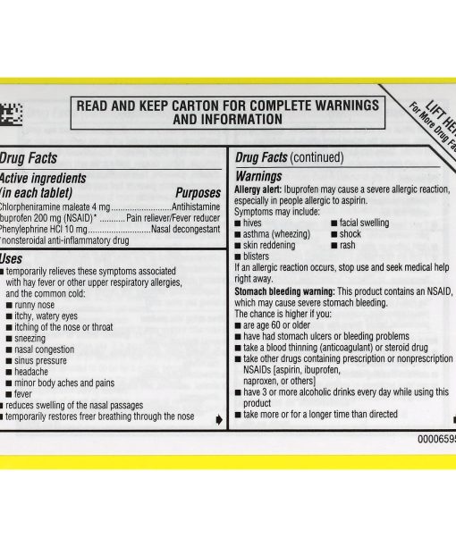Drug FactsActive Ingredients (in each tablet)PurposeChlorpheniramine maleate 4 mgAntihistamineIbuprofen 200 mg (NSAID)*Pain reliever/Fever reducerPhenylephrine HCl 10 mgNasal decongestant*nonsteroidal anti-inflammatory drugInactive IngredientsAcesulfame potassium, artificial flavors, carnauba wax, colloidal silicon dioxide, corn starch, croscarmellose sodium, glycerin, glyceryl dibehenate, hypromellose, lactic acid, lecithin, maltodextrin, medium-chain triglycerides, microcrystalline cellulose, pharmaceutical ink, polydextrose, polyvinyl alcohol, pregelatinized starch, propyl gallate, silicon dioxide, sucralose, synthetic iron oxide, talc, titanium dioxide, triacetin, xanthan gum.