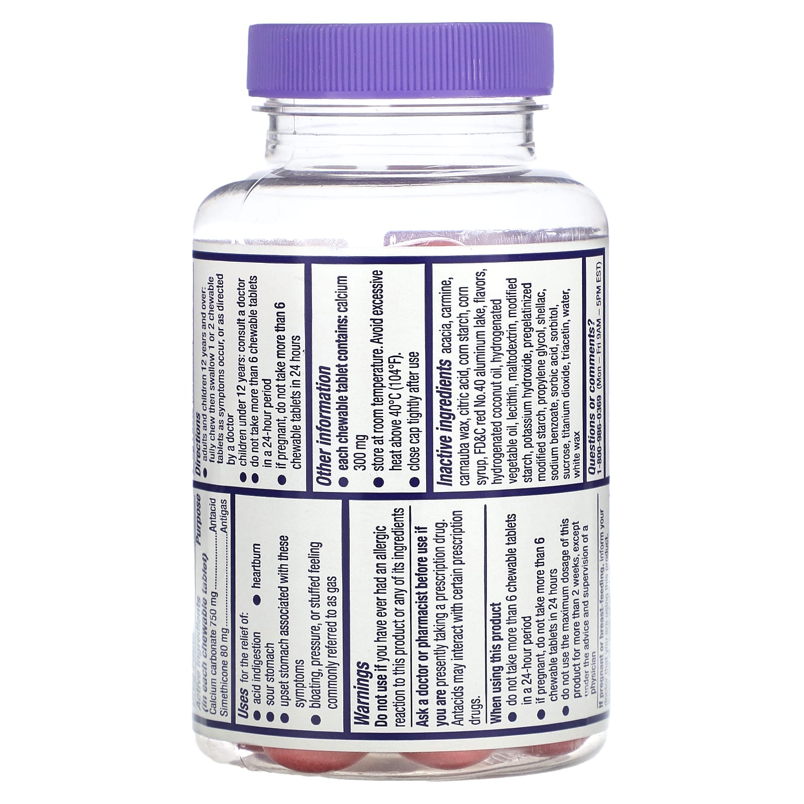 Drug FactsActive Ingredients (in each chewable tablet)PurposeCalcium carbonate 750 mgSimethicone 80 mcgAntacidAntigasInactive IngredientsAcacia, carmine, carnauba wax, citric acid, corn starch, corn syrup, FD&C red No.40 aluminum lake, flavors, hydrogenated coconut oil, hydrogenated vegetable oil, lecithin, maltodextrin, modified starch, potassium hydroxide, pregelatinized modified starch, propylene glycol, shellac, sodium benzoate, sorbic acid, sorbitol, sucrose, titanium dioxide, triacetin, water, white wax.Each chewable tablet contains: calcium 300 mg.