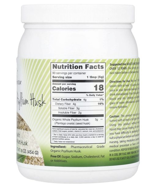 Pharmaceutical grade organic psyllium husk.Free of: Sugar, sodium, cholesterol, fat or additives.