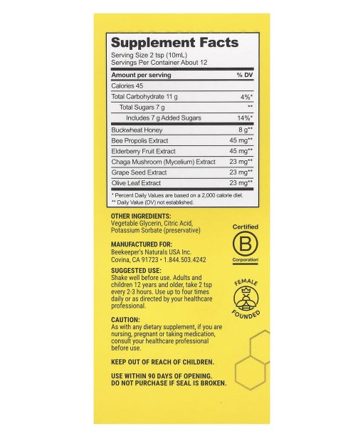 Highly Concentrated 45 mg Propolis Extract Per ServingImmunity Support ElixirMade With Buckwheat Honey + Elderberry + ChagaDietary SupplementCertified B CorporationFemale FoundedImmunity SupportThroat SoothingPowered by PropolisGluten FreeFeel Like Yourself Again. Immune-supporting and super- soothing ingredients that help you bounce back and recover.Benefits of Propolis: Delivers 300+ beneficial compounds, including vitamins, minerals, and antioxidants. Third-party pesticide testing to triple check that our hives and our products are pesticide-free. Known for protecting the hive, we use it to support our immune systems and combat free radical damage in the body.Sustainably Sourced. We never overharvest from our hives. We always ensure that our green apiaries are remote and far from harmful chemicals.