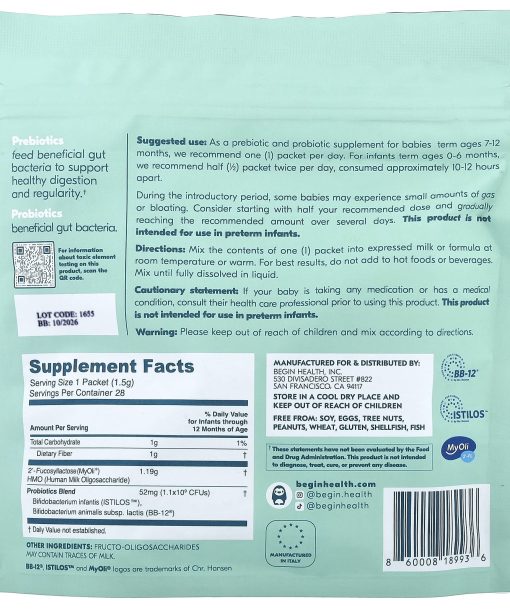 As a prebiotic and probiotic supplement for babies term ages 7-12 months, we recommend one (1) packet per day. For infants term ages 0-6 months, we recommend half (1/2) packet twice per day, consumed approximately 10-12 hours apart. During the introductory period, some babies may experience small amounts of gas or bloating. Consider starting with half your recommended dose and gradually reaching the recommended amount over several days. This product is not intended for use in preterm infants. Mix the contents of one (1) packet into expressed milk or formula at room temperature or warm. For best results, do not add to hot foods or beverages. Mix until fully dissolved in liquid.