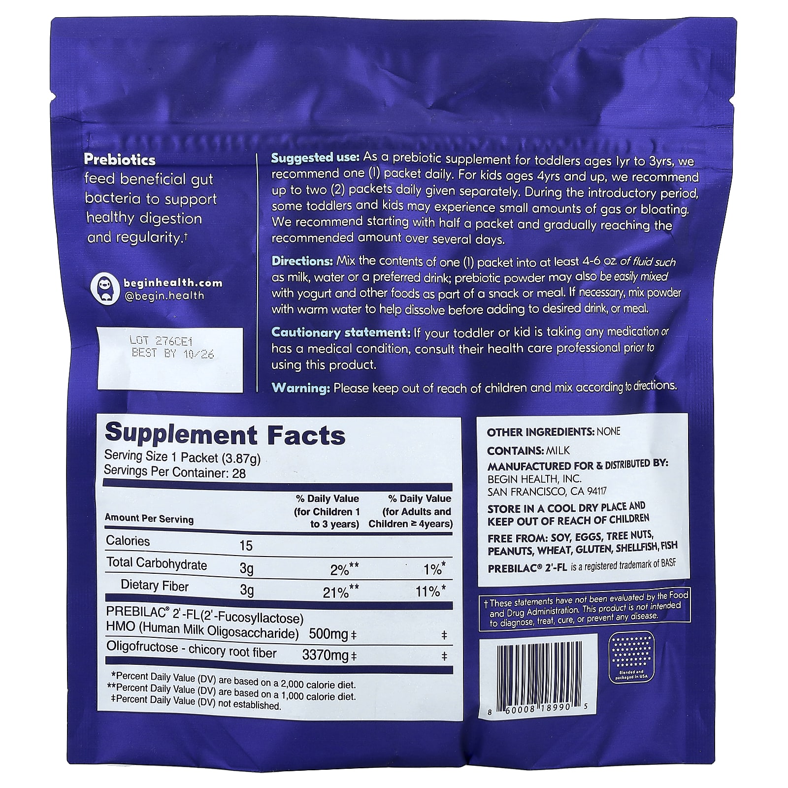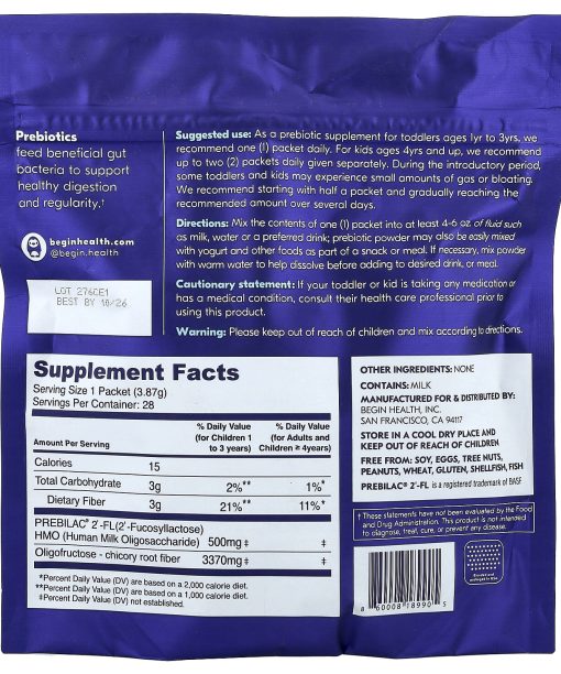 Begin Health, Kids, Growing Up Prebiotics, Ages 1+, Unflavored, 28 Packets, 0.13 oz (3.87 g) Each