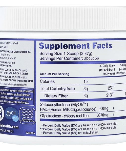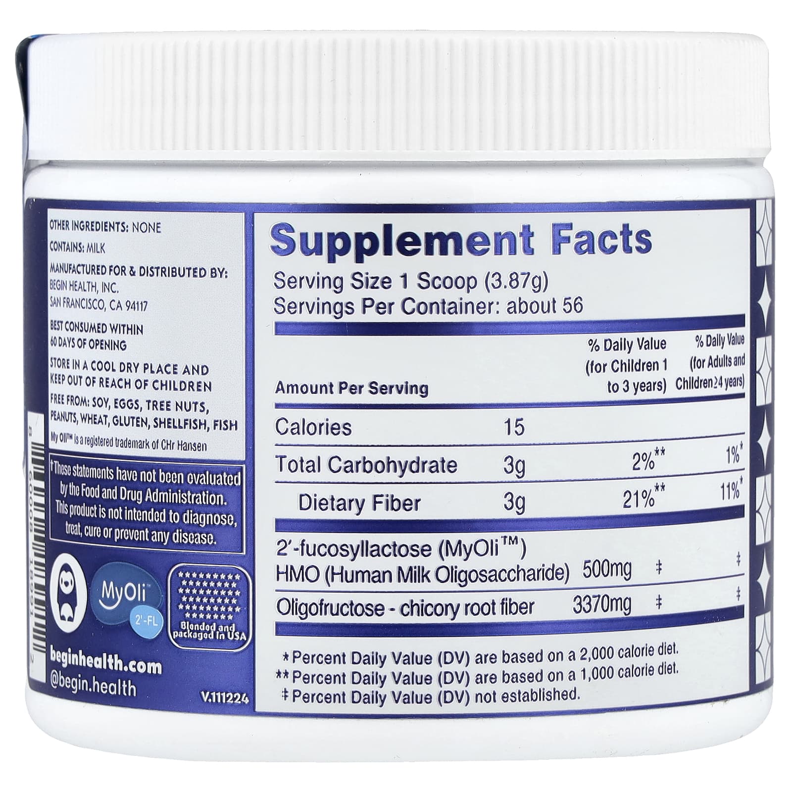 Daily Prebiotic Supplement For Toddlers and KidsFamily SizeMyOli™ 2′-FL2′-FL HMOHuman Milk OligosaccharideMolecular structure identical to the one found in breast milk.3 g FiberHigh quality source of fiberFrom chicory root for digestive health.Prebiotics feed beneficial gut bacteria to support healthy digestion and regularity.