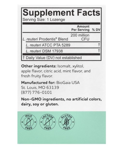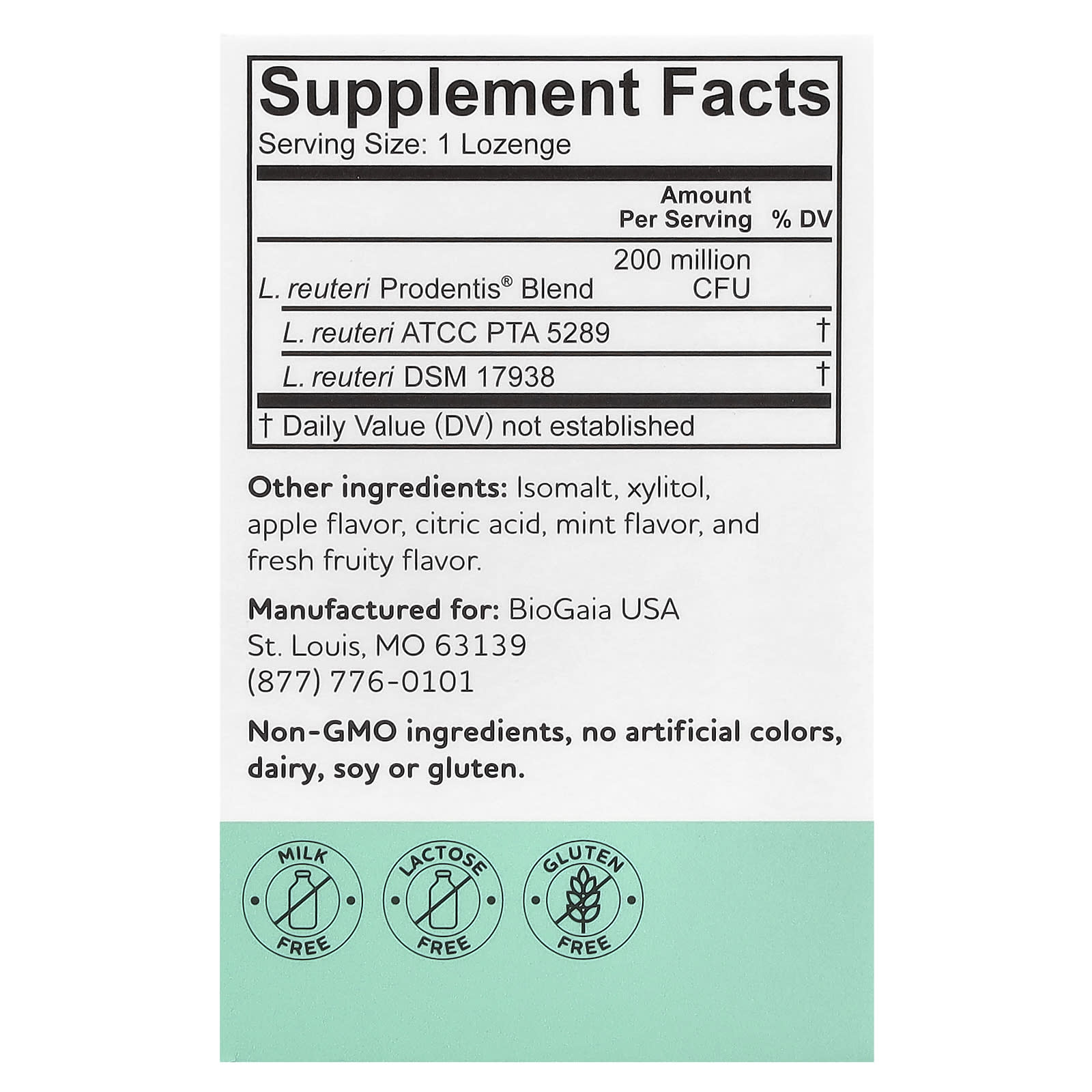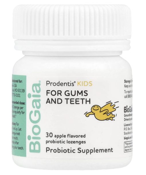 For Gums and Teeth Clinically ProvenProbiotic SupplementMilk FreeLactose FreeGluten FreeProbiotic Oral Health Groundbreaking Probiotics Driven By ScienceCountry of Origin: Sweden Probiotic lozenges. Apple flavored. BioGaia® Prodentis® KIDS is a dietary supplement containing the patented probiotic blend Limosilactobacillus reuteri Prodentis® (L. reuteri DSM 17938 and L. reuteri ATCC PTA 5289) that helps keep a natural balance in the mouth.Because L. reuteri Prodentis naturally colonizes humans it has a strong adaptation to persist and interact with humans. L. reuteri Prodentis has been tested in more than 60 clinical trials and proven effective and safe for children.