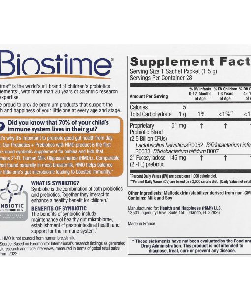 The World’s #1 Brand of Children’s Prebiotic and Probiotics Supplements‡Advanced Immune SupportSupports Digestion & ImmunitySupports Normal Growth & Development in Healthy InfantsMaintains & Restores Beneficial Gut Flora2.5 Billion CFU | 3 Clinically Proven StrainsHMO Biotic PlusDietary SupplementSynbiotic Pre- & ProbioticsBased on 20 Years of Scientific ResearchBiostime® is the world’s #1 brand of children’s probiotics supplements‡, with more than 20 years of scientific research and expertise. We’re proud to provide premium products that support the health and happiness of your little one at every age and stage.Did you know that 70% of your child’s immune system lives in their gut? That’s why it’s important to promote good gut health from day one. Our Probiotics + Prebiotics with HMO product is the first year-round synbiotic supplement for babies and kids that contains 2′-FL Human Milk Oligosaccharide (HMO)±. Comparable to that found naturally in most breastmilk, HMO helps balance your little one’s gut microbiome leading to boosted immunity.What Is Synbiotic? Synbiotic is the combination of both probiotics and prebiotics. Together they interact to enhance a healthy benefit for children. Benefits Of Synbiotic The benefits of synbiotic include maintenance of healthy gut microbiome, establishment of gastrointestinal health and support for the immune system.Enhances Immunity HMO prebiotics help build a protective wall in the gut by promoting growth of beneficial probiotics and balancing the micro-environment, nurturing a better Immune system. With 2′-FL HMO PrebioticSimilar to that found in breastmilk. Promotes Healthy Digestion High-quality and clinically tested probiotics help with nutrient absorption and healthy bowel movements. Contains B. infantis, a probiotic strain naturally found in abundance in the digestive tract of breastfed infants. ±2′-FL HMO is not sourced from human breastmilk. ‡Data Source: Based on Euromonitor International’s research findings as generated via desk research and trade interviews, measured in terms of global retail sales value from 2022.