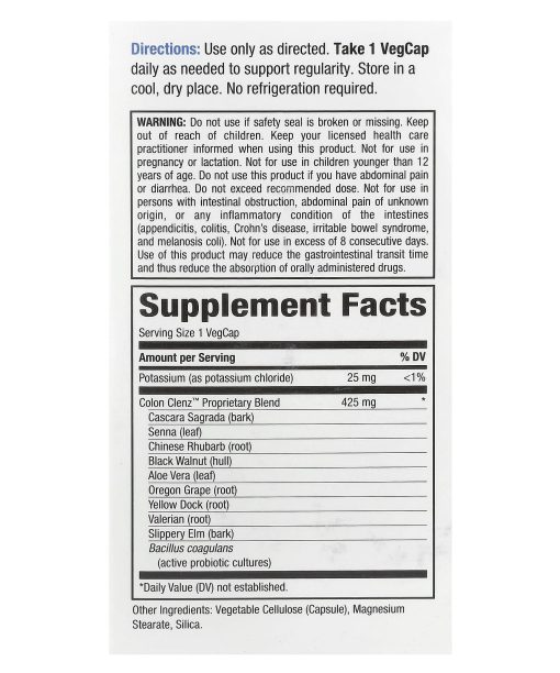 9 Herbals + ProbioticsRegularity & DetoxFast-ActingGentleDependableOnce DailyDietary SupplementSoy-Free & Dairy FreeVegetarian CapsulesNo Artificial Colors, Flavors or PreservativesFeel Clean, Fresh and RenewedAn internal cleansing program can help support regular bowel movements, detoxification, vitality, energy and overall health. Colon Clenz™ provides 9 cleansing herbal plus active probiotics (Bacillus coagulans) to help you feel refreshed and renewed.Cleansing Herbals – Active ProbioticsEasy 1 Capsule Dose When You Need ItSimple, dependable and effective – Colon Clenz™ with active probiotics is designed to help quickly and gently support internal cleansing and regular bowel movements.