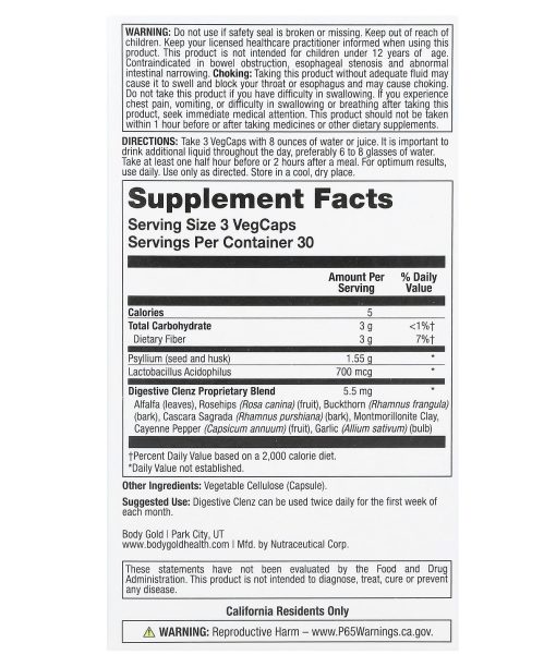 Advanced DetoxificationPsyllium + ProbioticsNature’s Cleansing FormulaNatural EliminationNutrient Absorption SupportOnce Daily Dietary SupplementGluten FreeNon-GMO | VeganPsyllium Seeds and HuskLactobacillus AcidophilusProprietary Blend of:Alfalfa LeavesRosehipsBuckthorn BarkMontmorillonite ClayCayenne PepperGarlic Digestive Clenz™ is a 100% nature-derived blend that is uniquely different because it contains both the psyllium seed and husk along with other key herbs. The ingredients are designed to work synergistically to provide nutritive support in assisting the body to naturally remove toxins and mucous from the colon and digestive system and for healthy nutrient absorption and elimination to promote overall good health. This formula encourages natural elimination. A feeling of fullness is common but if minor bloating or gas occurs, reduce amount taken and adjust intake gradually. Some individuals may decide to take Digestive Clenz™ daily if that is within a normal, healthy range.