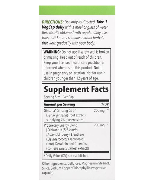 Once DailyNatural Powered by Ginseng G2G™Multi-Herb ComplexGuaranteed PotencyEasy 1 Capsule DoseEnergy & Endurance FormulaDietary SupplementEasy Dose Vegetarian CapsuleNo Caffeine, Added Sugar or Jarring Artificial StimulantsNo Grogginess or Energy Crash After-EffectsAccomplish More Every Day with Ginsana® EnergyNutritional energy and endurance formulaWorks with your body to help keep up with life’s demandsPowered by Ginseng G2G™Next generation Panax ginseng extract with 4% ginsenosides – guaranteed!Same level of energizing actives used in multiple clinical studiesPlus three synergistic energy herbs: Schizandra, Eleuthero and Green Tea
