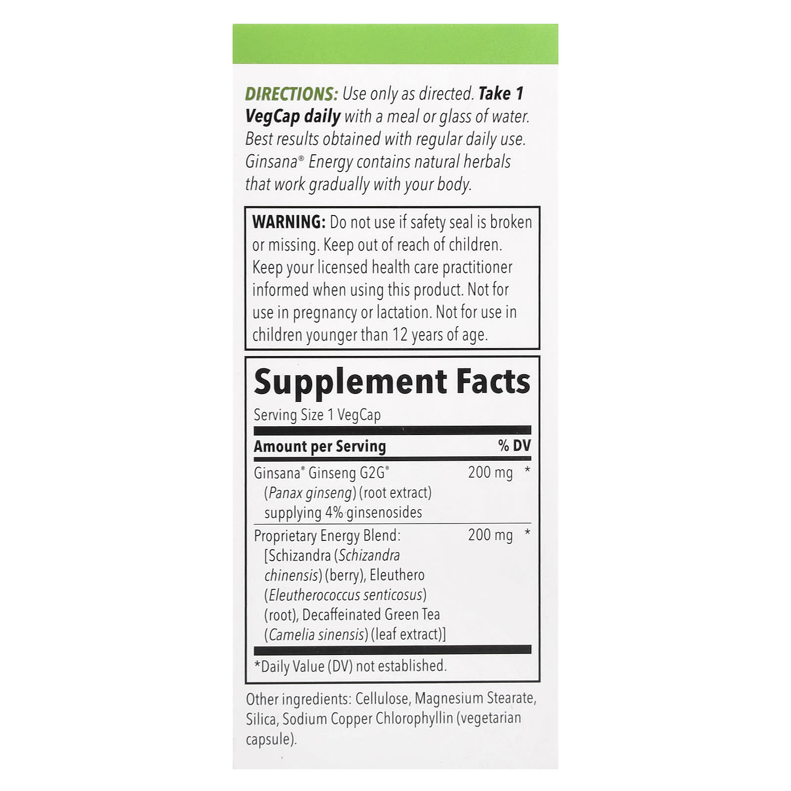 Use only as directed. Take 1 VegCap daily with a meal or glass of water. Best results obtained with regular daily use. Ginsana® Energy contains natural herbals that work gradually with your body.