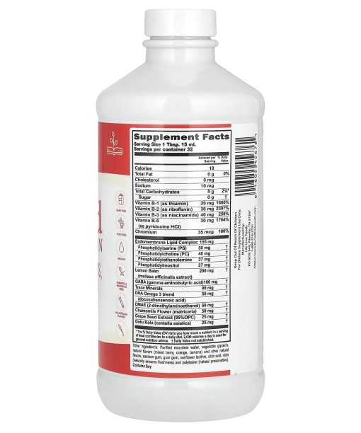Purified mountain water, vegetable glycerin, natural flavors (mixed berry, orange, banana) and other natural flavors, xanthan gum, guar gum, sunflower lecithin, citric acid, nisin (naturally ensures freshness) and polylysine (natural preservative).Contains Soy. This product is wheat, gluten, yeast and dairy free. This supplement also contains Endomembrane Lipid Complex and other beneficial elements like Lemon Balm, GABA, DHA Omega 3 blend, and Gotu Kola.