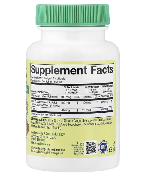 Nutrition for Kids!®Chewable!Great TasteSupports Healthy Brain & Eye DevelopmentDietary SupplementNSF – Certified Gluten FreeChildLife® Essentials Algae DHA is a naturally flavored, easty-to-take chewable softgel that provides your child with the omega-3 fatty acid DHA (Docosahexaenoic Acid) in the natural triglyceride (TG) form, exclusively sourced from microalga Schizochytrium sp. Combined with Vitamin A and Lutein, Algae DHA supports optimal brain and eye development, structure, and function.Health Tip: DHA accounts for over 95% of the total omega-3 fatty acids in the brain. Since the body alone cannot produce the DHA needed to support your child’s rapid growth, a healthy diet rich in DHA is vital for supporting and optimizing the development and function of your child’s brain and visual systems.