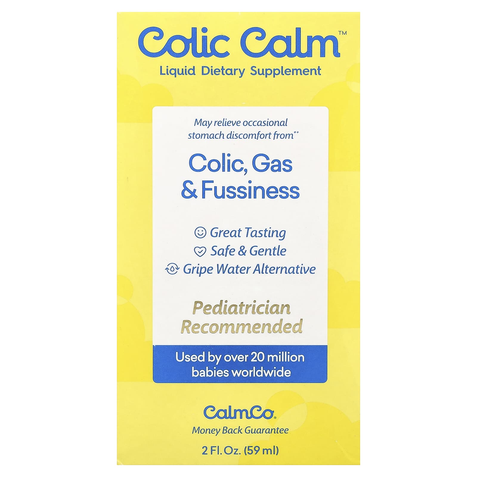 Liquid Dietary SupplementGreat TastingSafe & GentleGripe Water AlternativePediatrician RecommendedUsed by Over 20 Million Babies Worldwide CalmCo®May relieve occasional stomach discomfort from+ colic, gas & fussiness.+For colic that’s not due to a medical condition.