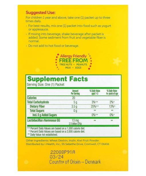 #1 Pediatrician Recommended Brand♦Regularity PacketsHelps Restore Regularity and Keep Digestive Systems Running SmoothlyProbiotic SupplementNo Flavor AddedNaturally Sourced LGG®Most Clinically Researched Strain in Children†Guaranteed Purity & Potency***Dairy, Gluten^, Soy FreeThe Culturelle® Difference∞Safe, Gentle & Drug FreeProbiotic + Naturally Sourced FiberCulturelle® Kids Probiotic + Fiber Regularity Packets are the safe, drug-free way to help keeps your kids regular.Sometimes, when kids can’t go, they need a gentle push. Culturelle® Kids Probiotic + Fiber works naturally with your child’s body to promote regularity.Our Gentle-Go® formula contains gluten free^ fiber extracted from kiwi, wheat & vegetables plus the probiotic strain most studied in children, Lactobacillus rhamnosus GG (LGG®)†.Our Brand ValuesWe’re on a mission to inspire better health & wellness for you & your family.We believe in integrity, so we hold ourselves to the highest standards of truth.We believe in the natural power of your body’s microbiome, & in scientific research & products that will unlock its full potential.We believe in uncompromising quality, safety & proven efficacy.We believe in empowering you to embrace every day with confidence.†Based on the number of Lactobacillus rhamnosus GG studies, as of January 2019.***Guaranteed potency through date on box when stored as directed.♦Based on a 2018 survey among pediatricians recommending a probiotic brand.^While this product contains an ingredient sourced from wheat, it meets the FDA’s definition of gluten free (less than 20 ppm gluten). Not a reduced calorie food.∞Excluded gummy formulas.