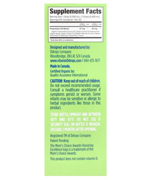 Herbal IngredientsMom’s Choice Awards Honoring ExcellenceFree from AlcoholDietary SupplementJust One Drop Free from Sodium Bicarbonate (baking soda) No Preservatives, Artificial Flavors or Colors Safe & Gentle BlendEuro DDropper™ TechnologyContents Certified NSFNon GMO Project VerifiedCertified Organic by: Quality Assurance InternationalHelps ease stomach discomfort from gas, colic, fussiness and hiccups. Baby Ddrops® Tummy Relief Drops are specifically designed for newborns providing the tried-and-true herbal ingredients in an easy-to-use drop format. This gentle, tummy taming blend helps relieve stomach discomfort often associated with colic and hiccups without preservatives or artificial fillers found in traditional gripe water. Organic Ginger Oil: An age-old root used to help relieve digestive upset, nausea and indigestion.Organic Fennel Oil: A long-standing herb with a history of helping to relieve gas, bloating and discomfort.Organic Chamomile Oil: An ancient herbal remedy known for its calming effect to promote restful sleep.