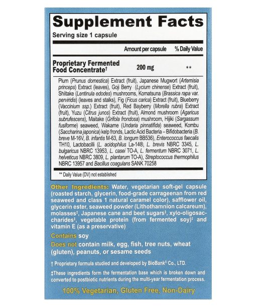 Water, vegetarian soft-gel capsule (roasted starch, glycerin, food-grade carrageenan from red seaweed and class 1 natural caramel color), safflower oil, glycerin ester, seaweed powder (Lithothamnion calcareum), molasses‡, Japanese cane and beet sugars‡, xylo-oligosaccharides‡, vegetable protein (from fermented soy)‡ and vitamin E (as a preservative).Contains soy. Does not contain milk, egg, fish, tree nuts, wheat (gluten), peanuts, or sesame seeds. ‡These ingredients form the fermentation base which is broken down and converted to postbiotic nutrients during the multi-year fermentation process.