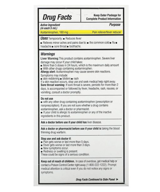 Keep outer package for complete product information.Liver Warning:This product contains acetaminophen. Severe liver damage may occur if your child takes: More than 5 doses in 24 hours, which is the maximum daily amount With other drugs containing acetaminophen. Allergy alert: Acetaminophen may cause severe skin reactions. Symptoms may include: skin reddening blistersrash If a skin reaction occurs, stop use and seek medical help right away. Sore throat warning: If sore throat is severe, persists for more than 2 days, is accompanied or followed by fever, headache, rash, nausea, or vomiting, consult a doctor promptly.Do not use with any other drug containing acetaminophen (prescription or nonprescription). If you are not sure whether a drug contains acetaminophen, ask a doctor or pharmacist. If your child is allergic to acetaminophen or any of the inactive ingredients in this product.Ask a doctor before use if your child has liver disease.Ask a doctor or pharmacist before use if your child is taking the blood thinning drug warfarin.Stop use and ask doctor if: Pain gets worse or last more than 5 days. Fever gets worse or last more than 3 days. New symptoms occur. Redness or swelling is present. These could be signs of a serious condition.Keep out of reach of children. In case of overdose, get medical help or contact a Poison Control Center right away. Prompt medical attention is critical even if you do not notice any signs or symptoms.Store at 68-77°F (20-25°C).Tamper evident: do not use if to flap of carton is open. Do not use if any vials are open or brokenChoking hazard small parts.