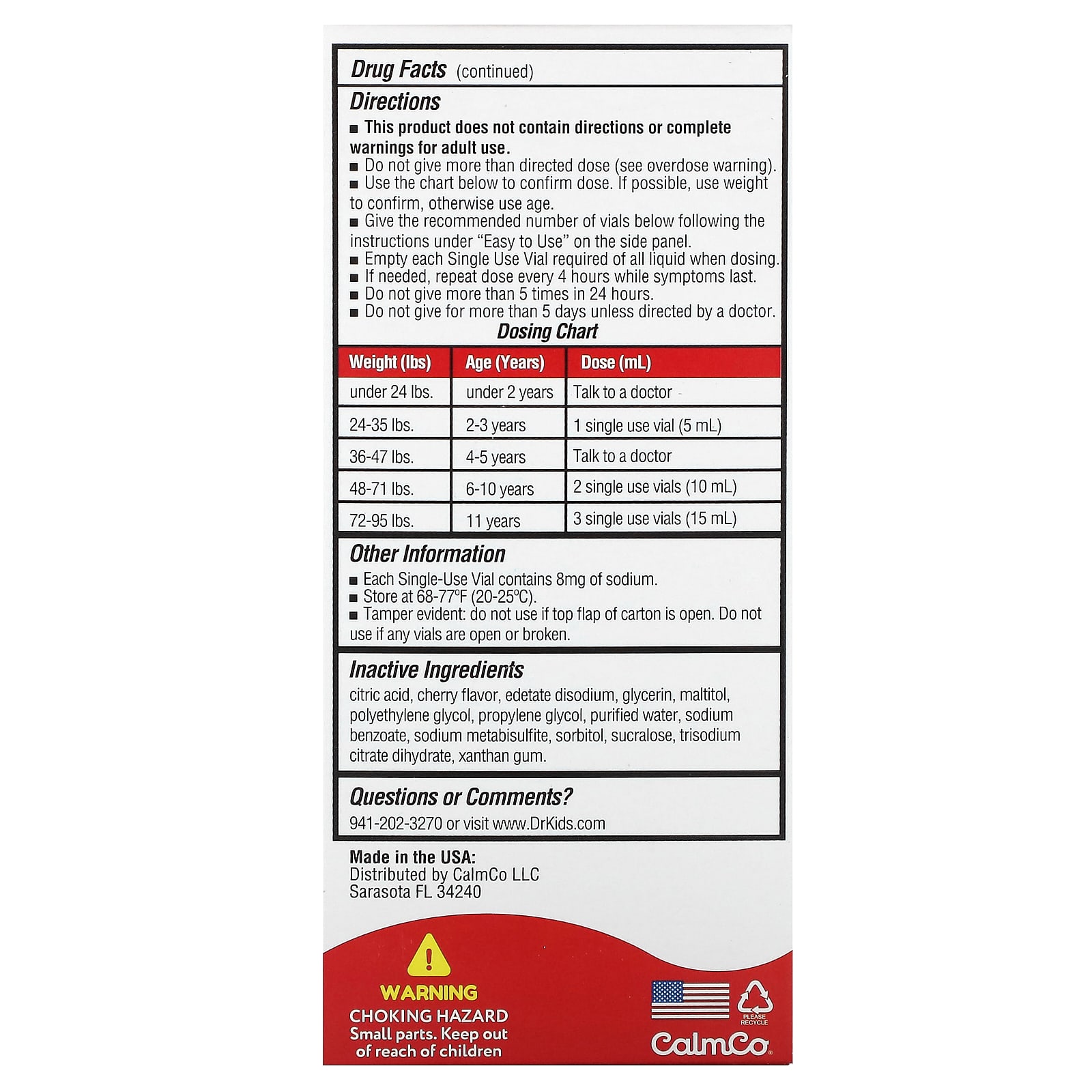 Easy to UseTap the vial to eliminate air bubblesTwist the top of the vial offSqueeze the liquid into child’s mouthThis product does not contain directions or complete warnings for adult use.Do not give more than directed dose (see overdose warning).Use the chart below to confirm dose. If possible, use weight to confirm, otherwise use age.Give the recommended number of vials below following the instructions under “Easy to Use” on the side panel.Empty each Single Use Vial required of all liquid when dosing.If needed, repeat dose every 4 hours while symptoms last.Do not give more than 5 times in 24 hours.Do not give for more than 5 days unless directed by a doctor.Dosing ChartWeight (lbs)Age (Years)Dose (ml)under 24 lbs.under 2 yearsTalk to a doctor24-35 lbs.2-3 years1 single use vial (5 ml)36-47 lbs.4-5 yearsTalk to a doctor48-71 lbs.6-10 years2 single use vial (10 ml)72-95 lbs.11 years3 single use vial (15 ml)