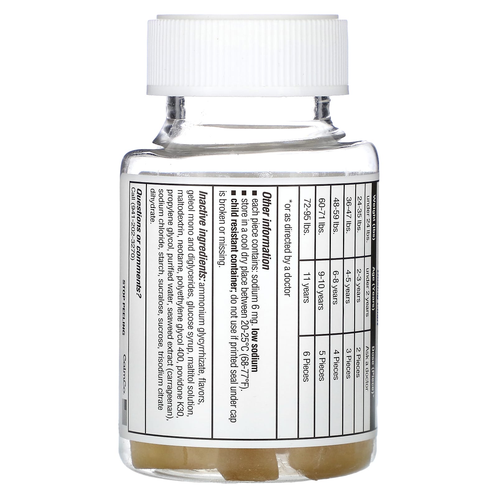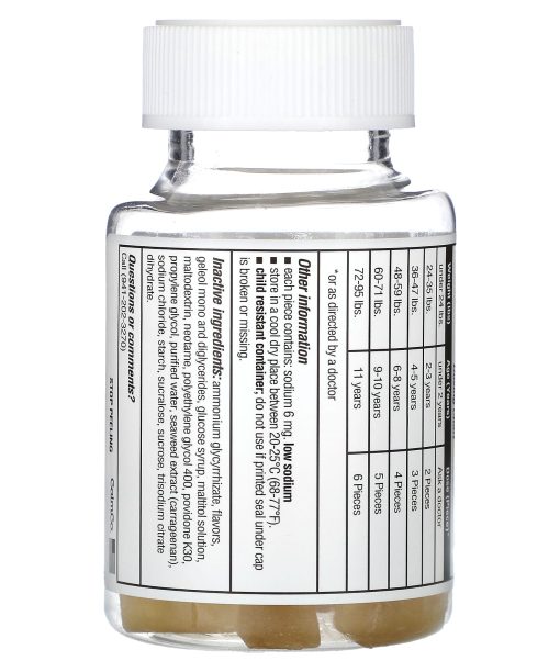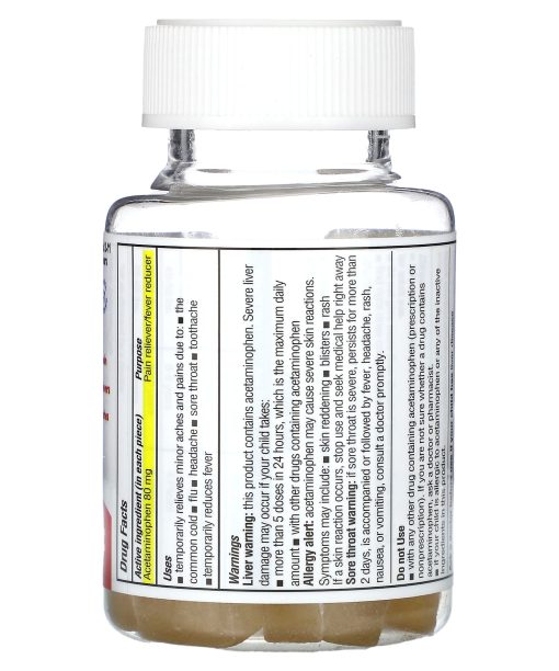 Liver warning: this product contains acetaminophen. Severe liver damage may occur if your child takes: more than 5 doses in 24 hours, which is the maximum daily amount with other drugs containing acetaminophen Allergy alert: acetaminophen may cause severe skin reactions. Symptoms may include: skin reddening blisters rash If a skin reaction occurs, stop use and seek medical help right away Sore throat warning: if sore throat is severe, persists for more than 2 days, is accompanied or followed by fever, headache, rash, nausea, or vomiting, consult a doctor promptly.Do not use with any other drug containing acetaminophen (prescription or nonprescription). If you are not sure whether a drug contains acetaminophen, ask a doctor or pharmacist. if your child is allergic to acetaminophen or any of the inactive ingredients in this product. Ask a doctor before use if your child has liver disease.Ask a doctor or pharmacist before use if your child is taking the blood thinning drug warfarin.When using this product do not exceed recommended dose.Stop use and ask doctor ifPain gets worse or last more than 5 daysFever gets worse or last more than 3 daysNew symptoms occurRedness or swelling is presentThese could be signs of a serious condition.Keep out of reach of children. In case of overdose, get medical help or contact a Poison Control Center right away. Quick medical attention is critical even if you do not notice any signs or symptomsEach piece contains: sodium 6 mg. low sodium Store in a cool dry place between 20-25℃ (68-77ºF). Child resistant container; do not use if printed seal under cap is broken or missing.
