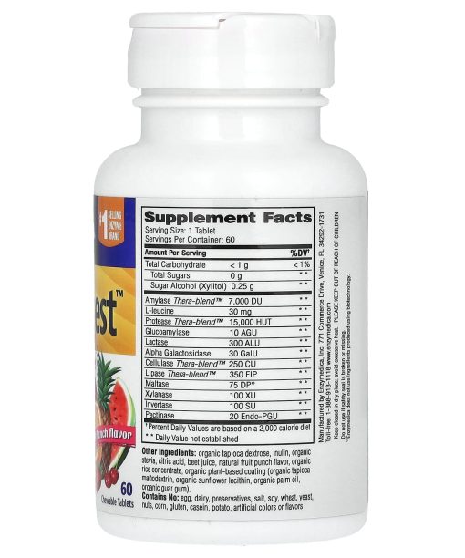 #1 Selling Enzyme BrandNaturally Sweetened with Sugar-Free XylitolGentle Support for Digestion and Nutrient AbsorptionNon-GMOVegan Dietary SupplementNo Artificial Fillers or SweetenersKids Digest™ provides digestive enzymes that help the body break down the components of a meal, like fats, fibers, protein and carbohydrates. Enzymes are crucial for nutrient absorption, and can also reduce occasional gas, bloating and indigestion from eating problem foods.Thera-blend™ is an exclusive process that combines multiple strains of enzymes that work in specific pH levels, resulting in superior performance in the body.