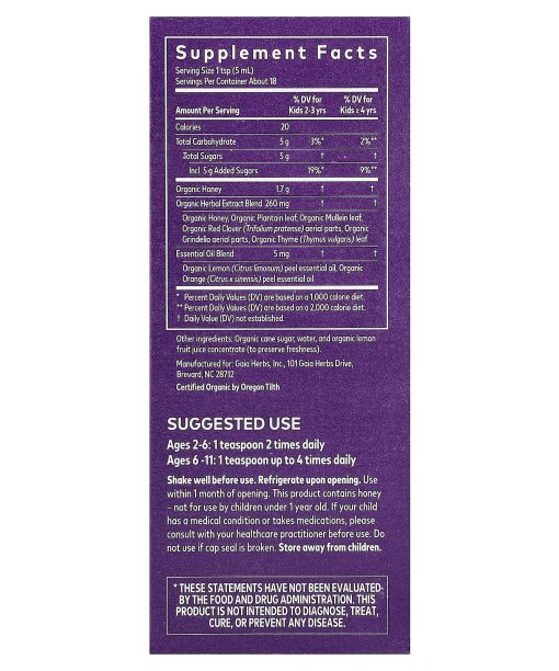 Immune SupportUSDA OrganicSupports Overall Throat & Lung Health for Your  Little OnesDelicious Herbal Blend with Grindelia & Organic HoneyHerbal SupplementEst 1987 USAIntegrity, Purity, PotencyNon GMO Project VerifiedCertified Organic by Oregon TilthThe Gaia DifferenceGreat-TastingMade with Organic HoneyNothing ArtificialNo Added Flavors or ColorsConnecting People, Plants & PlanetPurity – All products are screened for pesticides, microbes & heavy metals.Potency – Concentrated extracts provide a delicious & convenient way to get your daily dose of herbs.Integrity – The world’s first herb traceability platform.