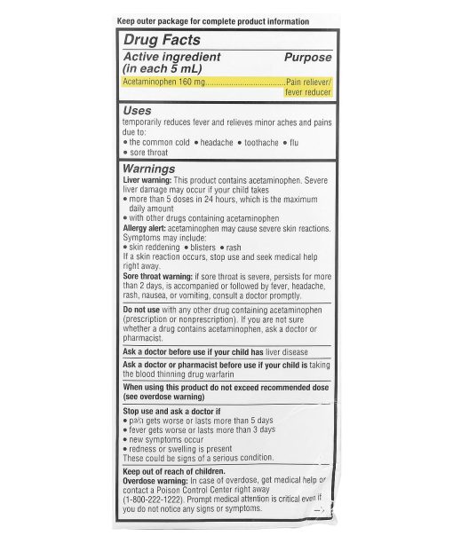 Use only enclosed syringe.Keep outer package for complete product information.Liver warning: This product contains acetaminophen. Severe liver damage may occur if your child takes more than 5 doses in 24 hours, which is the maximum daily amount. with other drugs containing acetaminophenAllergy alert: acetaminophen may cause severe skin reactions. Symptoms may include: skin reddeningblistersrash If a skin reaction occurs, stop use and seek medical help right away. Sore throat warning: if sore throat is severe, persists for more than 2 days, is accompanied or followed by fever, headache, rash, nausea, or vomiting, consult a doctor promptly. Do not use with any other drug containing acetaminophen (prescription or nonprescription). If you are not sure whether a drug contains acetaminophen, ask a doctor or pharmacist. Ask a doctor before use if your child has liver disease. Ask a doctor or pharmacist before use if your child is taking the blood thinning drug warfarin. When using this product do not exceed recommended dose (see overdose warning). Stop use and ask a doctor if pain gets worse or lasts more than 5 daysfever gets worse or lasts more than 3 daysnew symptoms occurredness or swelling is present. These could be signs of a serious condition. Keep out of reach of children. Overdose warning: In case of overdose, get medical help or contact a Poison Control Center right away. Prompt medical attention is critical even if you do not notice any signs or symptoms.Store between 20-25°c (68-77°F) do not refrigerateTamper evident: Do not use if perforated band around the bottle is disturbed or missing. This product does not contain directions or complete warnings for adult use.