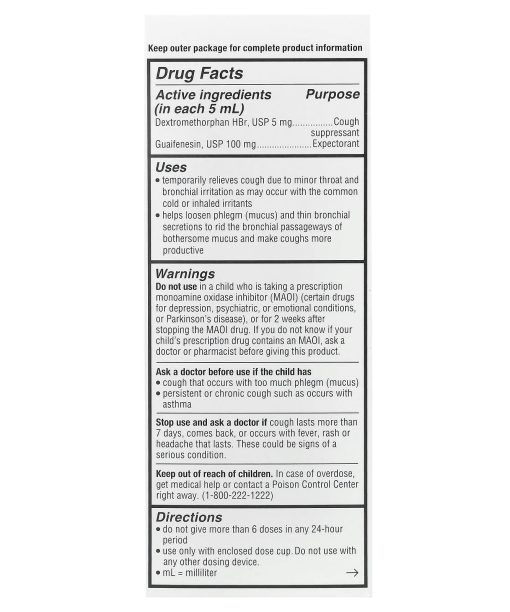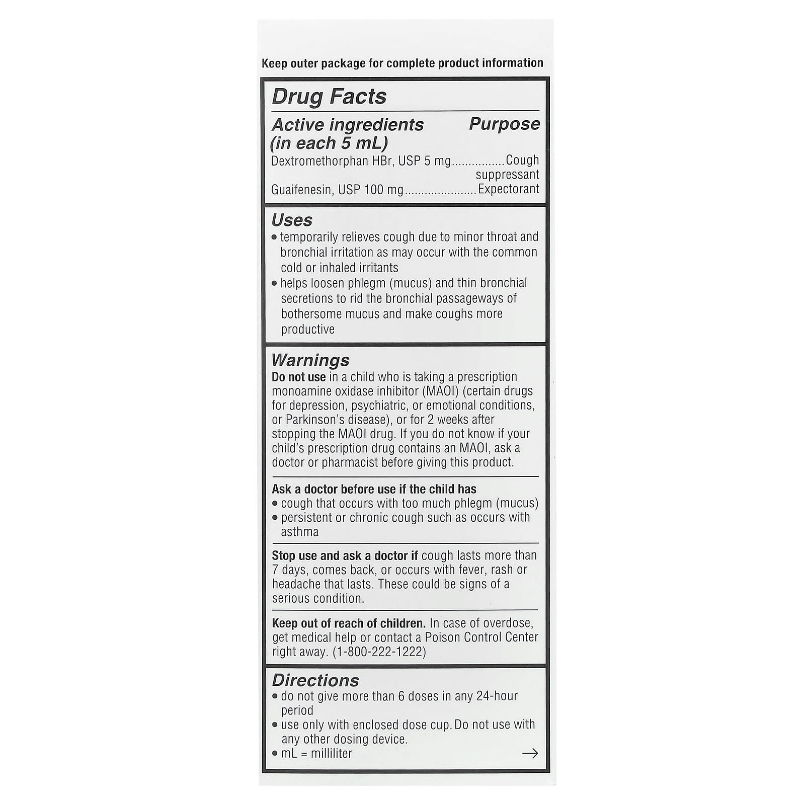 Keep outer package for complete product information. Do not use in a child who is taking a prescription monoamine oxidase inhibitor (MAOI) (certain drugs for depression, psychiatric, or emotional conditions, or Parkinson’s disease), or for 2 weeks after stopping the MAOI drug. If you do not know if your child’s prescription drug contains an MAOI, ask a doctor or pharmacist before giving this product. Ask a doctor before use if your child hasCough that occurs with too much phlegm (mucus)Persistent or chronic cough such as occurs with asthmaStop use and ask a doctor if cough lasts more than 7 days, comes back, or occurs with fever, rash or headache that lasts. These could be signs of a serious condition. Keep out of reach of children. In case of overdose, get medical help or contact a Poison Control Center right away.Store between 20-25ºC (68-77ºF).Bottle is safety sealed with a perforated band around bottle. Do not use if bottle seal is disturbed or missing.