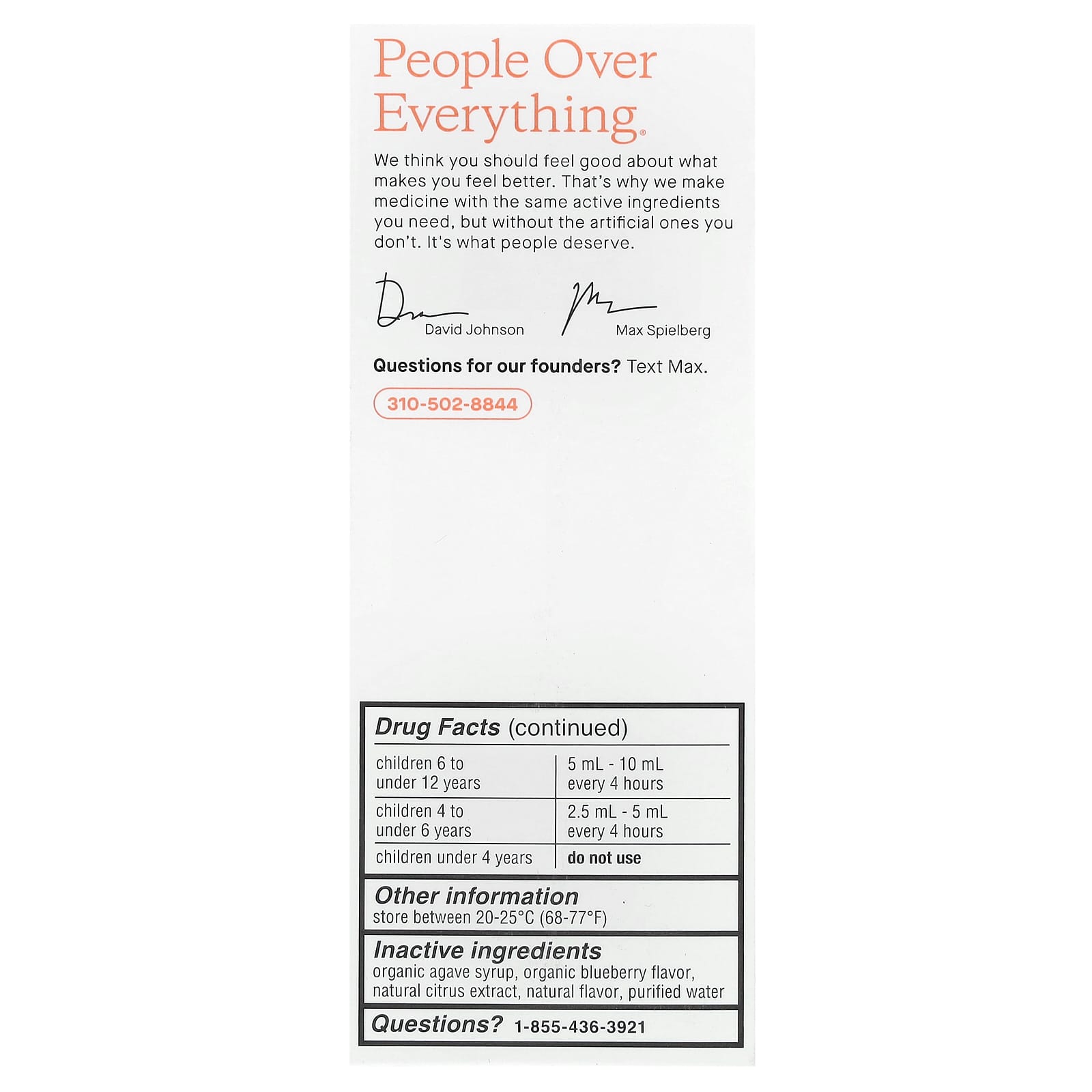 Medicine Made Clean Dextromethorphan HBr | GuaifenesinCough Supressant – ExpectorantCough MucusChest Congestion Same Effective Active Ingredient, but No Artificial FillersNon GMO Project Verified Dosing Cup Included Certified B CorporationCertified Gluten-FreeCertified Vegan Only Ingredients People Deserve Dextromethorphan HBrGuaifenesinOrganic Agave SyrupOrganic Blueberry FlavorNatural Citrus ExtractNatural Flavor Purified Water And that’s all. Uses: Temporarily relieves cough due to minor throat and bronchial irritation as may occur with the common cold or inhaled irritants.Helps loosen phlegm (mucus) and thin bronchial secretions to rid the bronchial passageways of bothersome mucus and make coughs more productive.People Over Everything. We think you should feel good about what makes you feel better. That’s why we make medicine with the same active ingredients you need, but without the artificial ones you don’t. It’s what people deserve.
