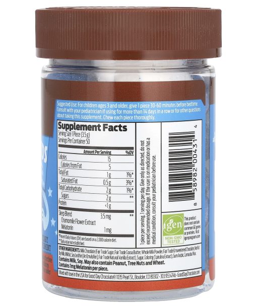 Nighty-Night, Sleep TightDoctor FoundedMade With Fair-Trade Milk Chocolate1 mg Melatonin Per PieceDietary SupplementSafe and Effective for Children 3 Years or OlderIgen™ – Non-GMO TestedProvide gentle and safe sleep relief for your kiddos with Good Day Chocolate Kids Sleep. With 1mg of pharmaceutical grade melatonin – a pediatrician recommended sleep supplement for children ages 3 and older – you can help your little one get a good night’s rest to wake up to a Good Day!