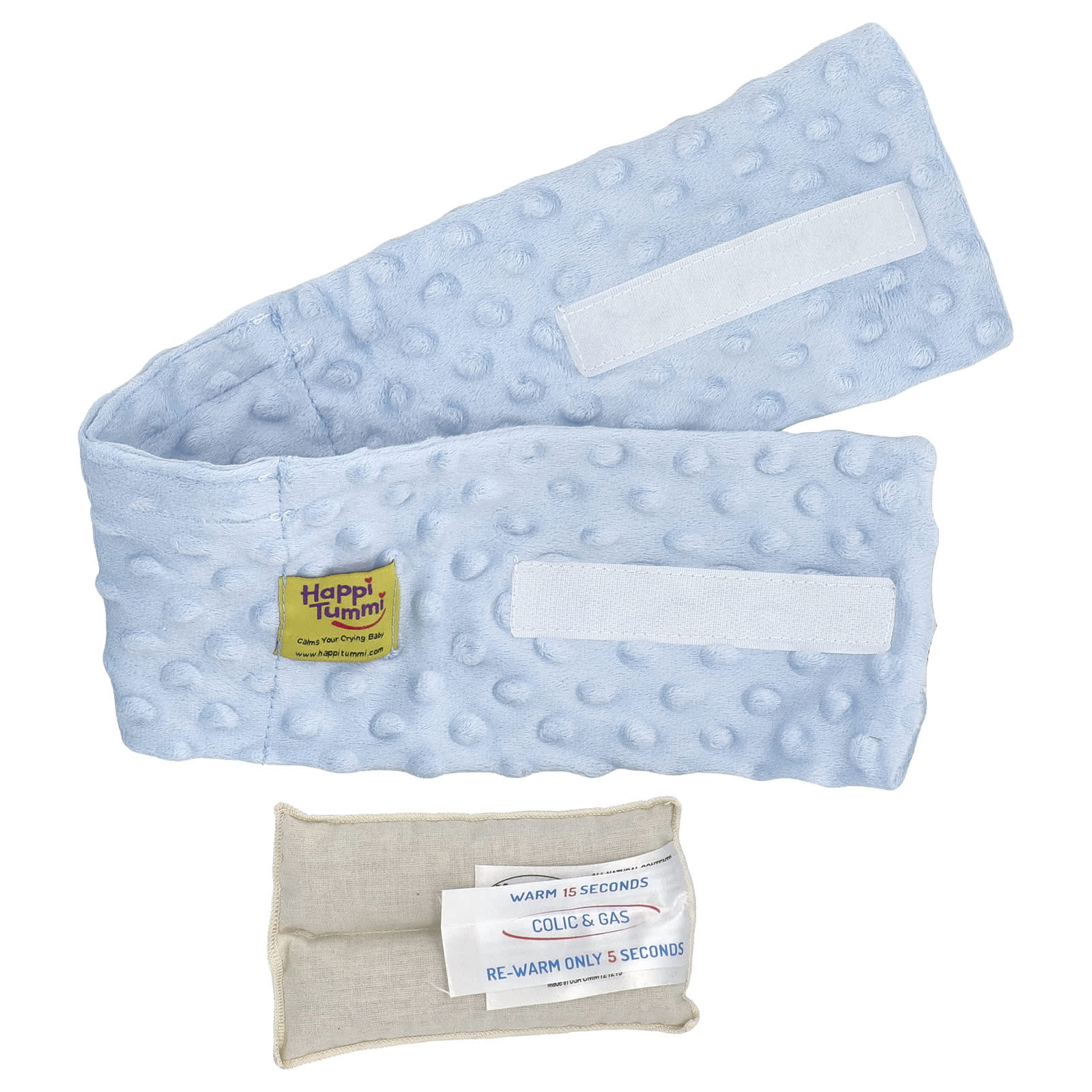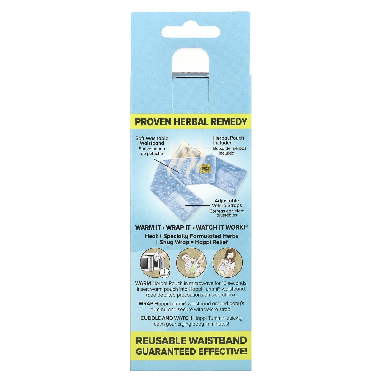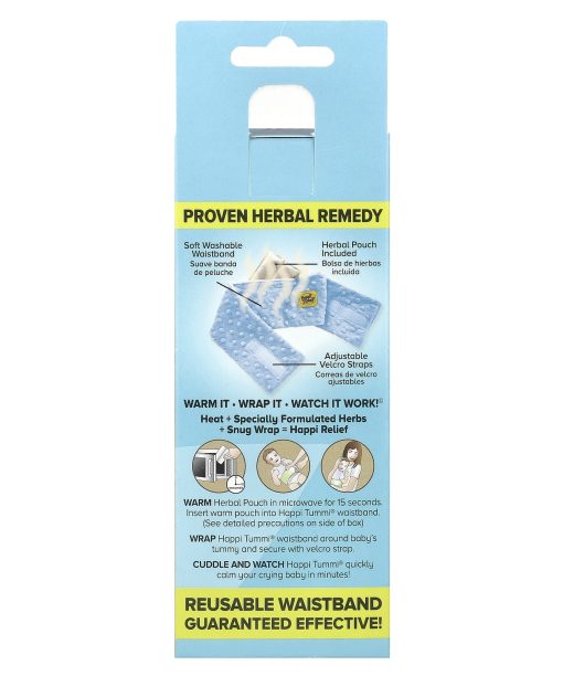 Warm: Herbal Pouch in microwave for 15 seconds. Insert warm pouch into Happi Tummi® waistband. (See detailed precautions on side of box). Wrap: Happi Tummi® waistband around baby’s tummy and secure with velcro strap. Cuddle and Watch: Happi Tummi® quickly calm your crying baby in minutes!
