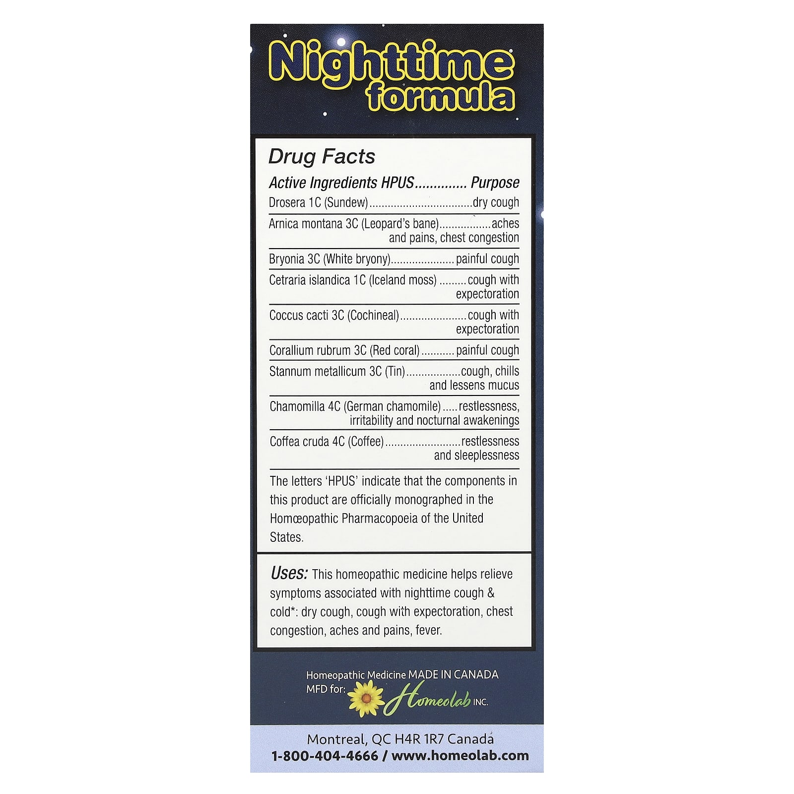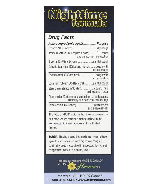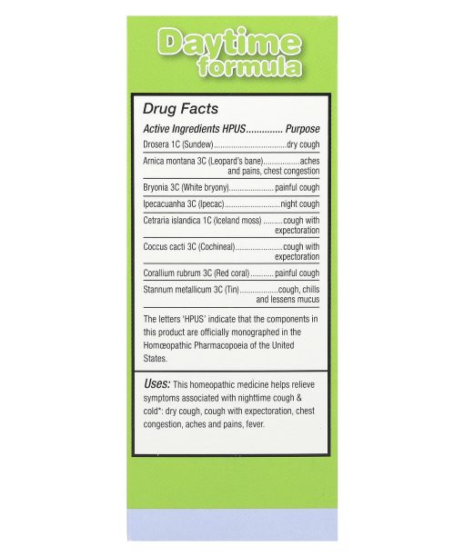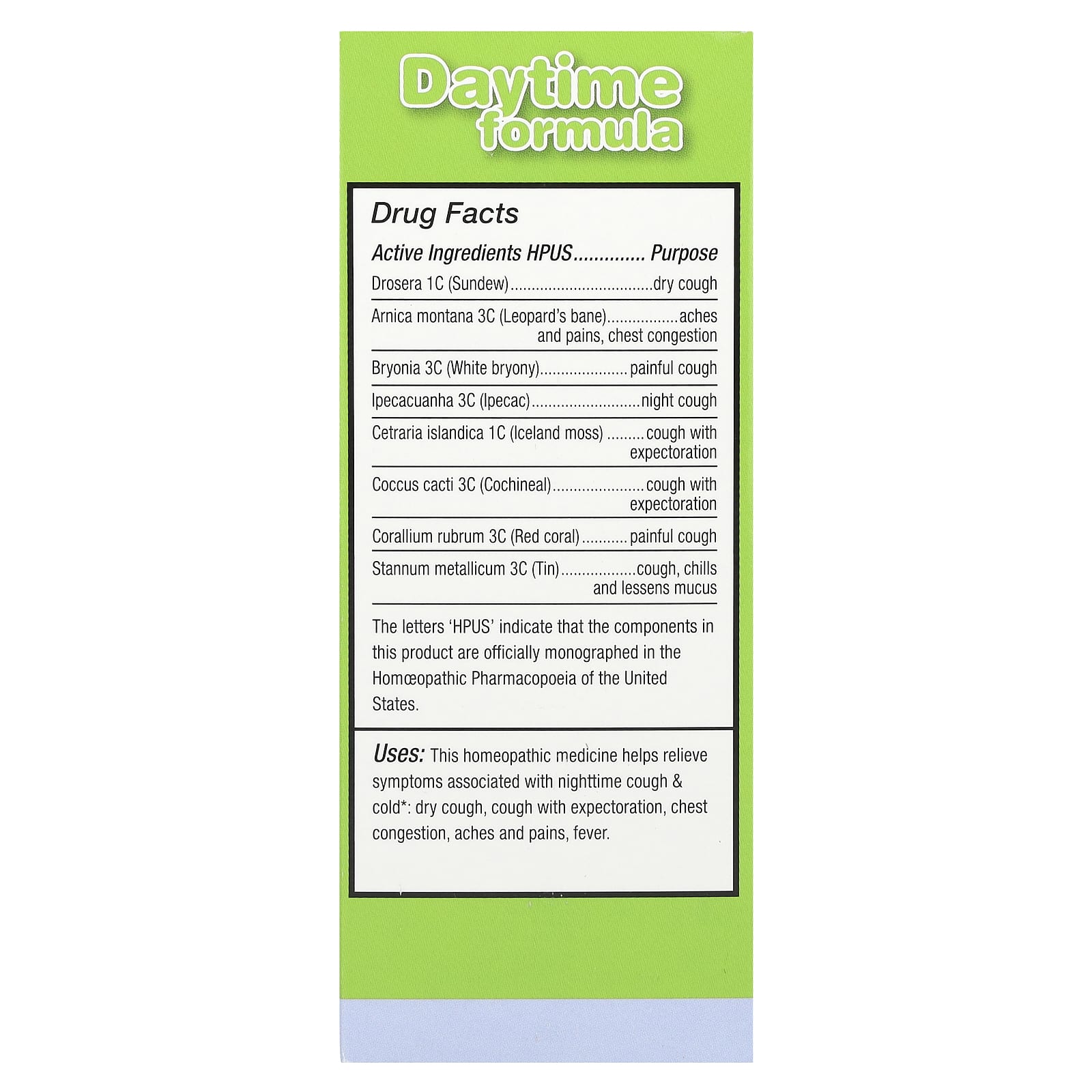 Drug Facts: Daytime Formula Active Ingredients HPUSPurposeDrosera 1C (Sundew)Arnica montana 3C (Leopard’s bane)Bryonia 3C (White bryony)Ipecacuanha 3C (Ipecac)Cetraria islandica 1C (Iceland moss)Coccus cacti 3C (Cochineal)Corallium rubrum 3C (Red coral)Stannum metallicum 3C (Tin)dry coughaches and pains, chest congestionpainful coughnight coughcough with expectorationcough with expectorationpainful coughcough, chills and lessens mucusInactive IngredientsPurified water, sorbitol, caramel, sodium benzoate, potassium sorbate, citric acid.The letters ‘HPUS’ indicate that the components in this product are officially monographed in the Homeopathic Pharmacopoeia of the United States.Drug Facts: Nighttime Formula Active Ingredients HPUS PurposeDrosera 1C (Sundew)Arnica montana 3C (Leopard’s bane)Bryonia 3C (White bryony) Cetraria islandica 1C (Iceland moss)Coccus cacti 3C (Cochineal) Corallium rubrum 3C (Red coral)Stannum metallicum 3C (Tin)Chamomilla 4C (German chamomile)Coffea cruda 4C (Coffee) dry coughaches and pains, chest congestionpainful coughcough with expectorationcough with expectorationpainful coughcough, chills and lessens mucusrestlessness irritability and nocturnal awakeningsrestlessness and sleeplessnessInactive IngredientsPurified water, sorbitol, caramel, sodium benzoate, potassium sorbate, citric acid.The letters ‘HPUS’ indicate that the components in this product are officially monographed in the Homeopathic Pharmacopoeia of the United States.
