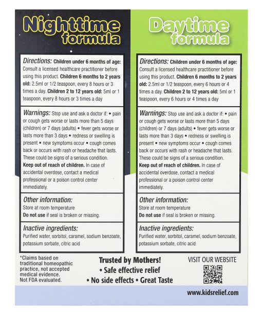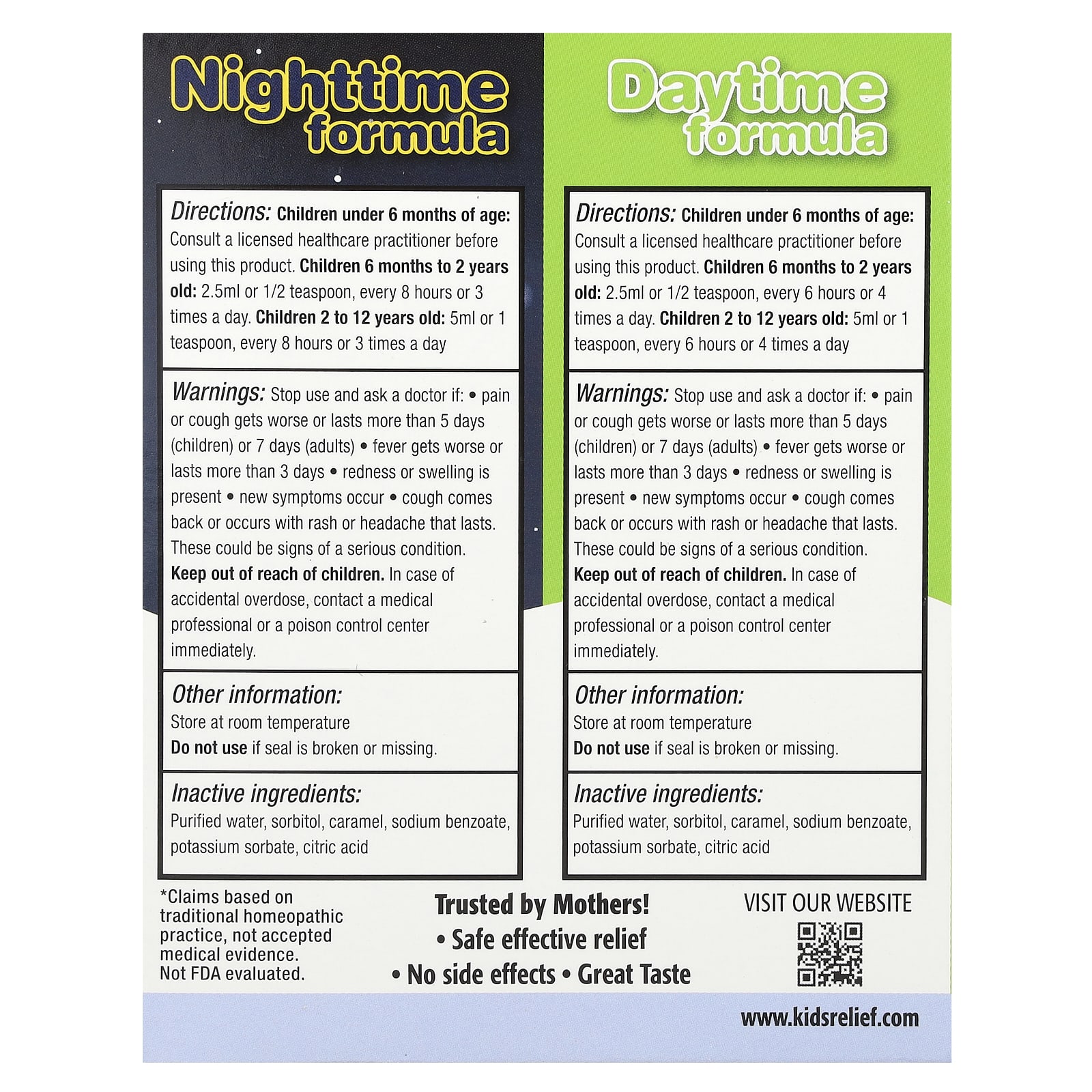 Great TasteSafe – No Side Effects, No Drug InteractionGluten Free, Dye Free, Sugar Free Homeopathic Medicine Trusted by Mothers!Contains: Daytime FormulaNighttime Formula Daytime FormulaEffective relief that helps:Relieve dry cough Relieve chest congestionThin and loosen mucusSuppress coughRelieve pain and reduce feverUses: This homeopathic medicine helps relieve symptoms associated with nighttime cough & cold *: dry cough, cough with expectoration, chest congestion, aches and pains, fever.Nighttime FormulaEffective relief that helps:Relieve dry cough  Relieve chest congestionThin and loosen mucusRelieve pain and reduce fever Uses: This homeopathic medicine helps relieve symptoms associated with nighttime cough & cold *: dry cough, cough with expectoration, chest congestion, aches and pains, fever.*Claims based on traditional  homeopathic practice, not accepted medical evidence. Not FDA evaluated.