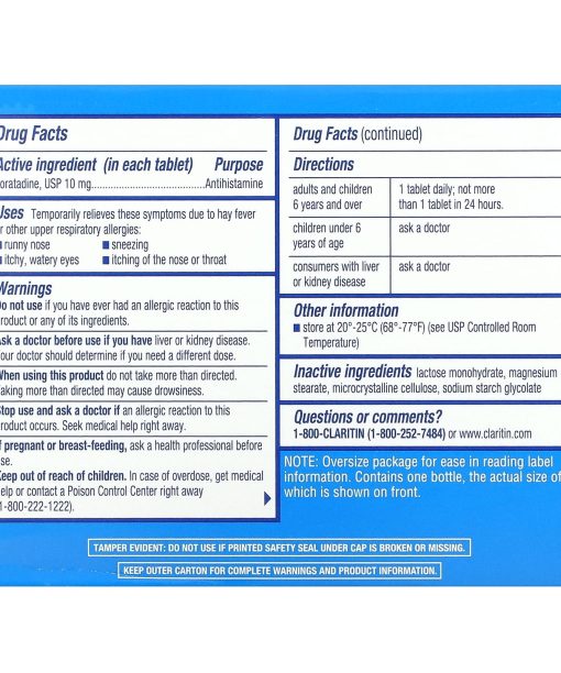 Original Prescription Strength Loratadine 10 mg / Antihistamine24 Hour Indoor & Outdoor AllergiesUse: temporarily relieves these symptoms due to hay fever or other upper respiratory allergies: 24 hour relief of: Sneezing Runny Nose Itchy, Watery EyesItchy Throat or Nose *When taken as directed.