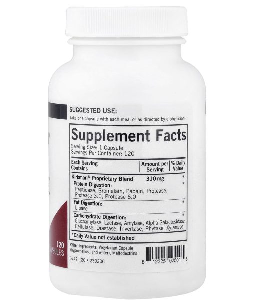 Supports Digestion of a High Protein MealDietary Supplement Ultra Tested cGMP CertifiedEnZym-Complete with DPP-IV™ is Kirkman’s popular broad- spectrum digestive enzyme. This proprietary product is formulated to support digestive activity for a full range of foods.The product is formulated with a unique blend of 17 pure, plant-based enzymes that are recognized as essential for the effective digestion of all food groups, including proteins, carbohydrates, fats, sugars and fiber under a wide range of pH conditions. The addition of the dipeptidyl peptidase-IV (DPP-IV) enzyme analog supports the ability of the body to degrade peptides formed from exposure to casein and gluten.EnZym-Complete/DPP-IV™ provides a comprehensive “foundation” of supplemental enzymes to support optimal digestion. Each enzyme works independently, but also in a complementary role to optimally impact digestion of all dietary components.This unique enzyme formulation also provides a combination of proteases, amylases, lipases, disaccharides and cellulases that replace the enzymes lost in cooking, thus lessening the burden on the body’s digestive tract so that it can function optimally, while also supporting optimal nutrient absorption.
