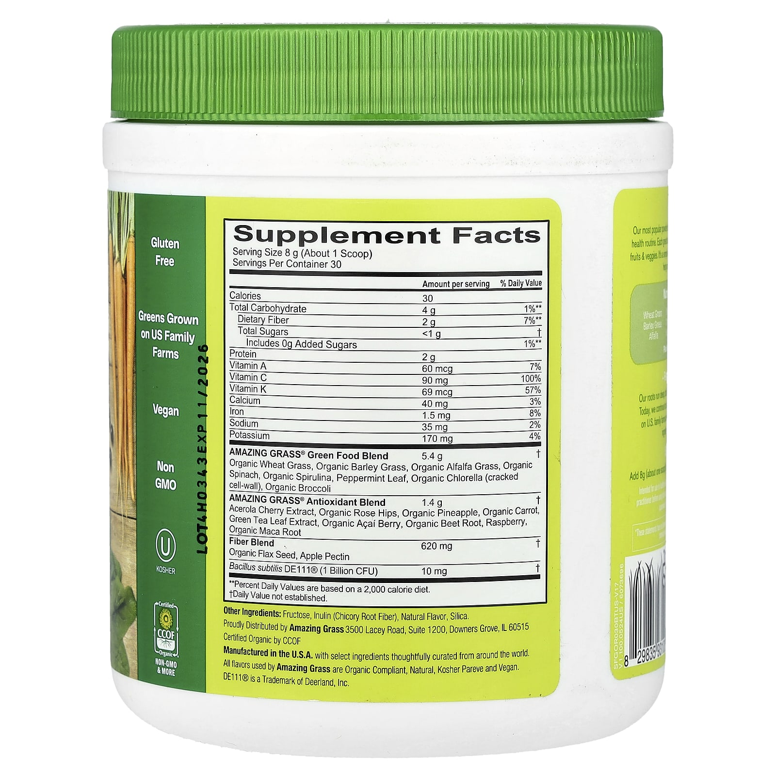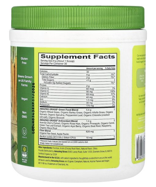 The OriginalSupports VitalitySupports ImmunitySupports Gut HealthDietary SupplementGluten FreeGreens Grown on US Family FarmsVeganNon GMOKosherCertified Organic by CCOF1 Billion CFU ProbioticsA Blend of 14 Greens, Fruits & Veggies100% DV of Vitamin CConvenient PowderThe Original Our most popular powder blend is an easy way to add more whole food nutrition to your health routine. Each great tasting scoop contains a blend of nutritious greens, fruits & veggies. It’s a simple way to support your overall health and wellness to help you feel amazing every day.Nutrition Made Easy.Wheat Grass Barley Grass AlfalfaSpirulina Chlorella Broccoli SpinachBeet Root Carrot PineappleAcai Berry Maca RootPlus: Acerola Cherry & More…Farm Family Roots Our roots run deep, back to a 3rd generation family farm in Kansas. Today, we continue to use organically grown, cereal grasses produced on U.S. family farms and craft them with high-quality plant-based ingredients from around the world.All flavors used by Amazing Grass are organic compliant, natural, kosher pareve and vegan.