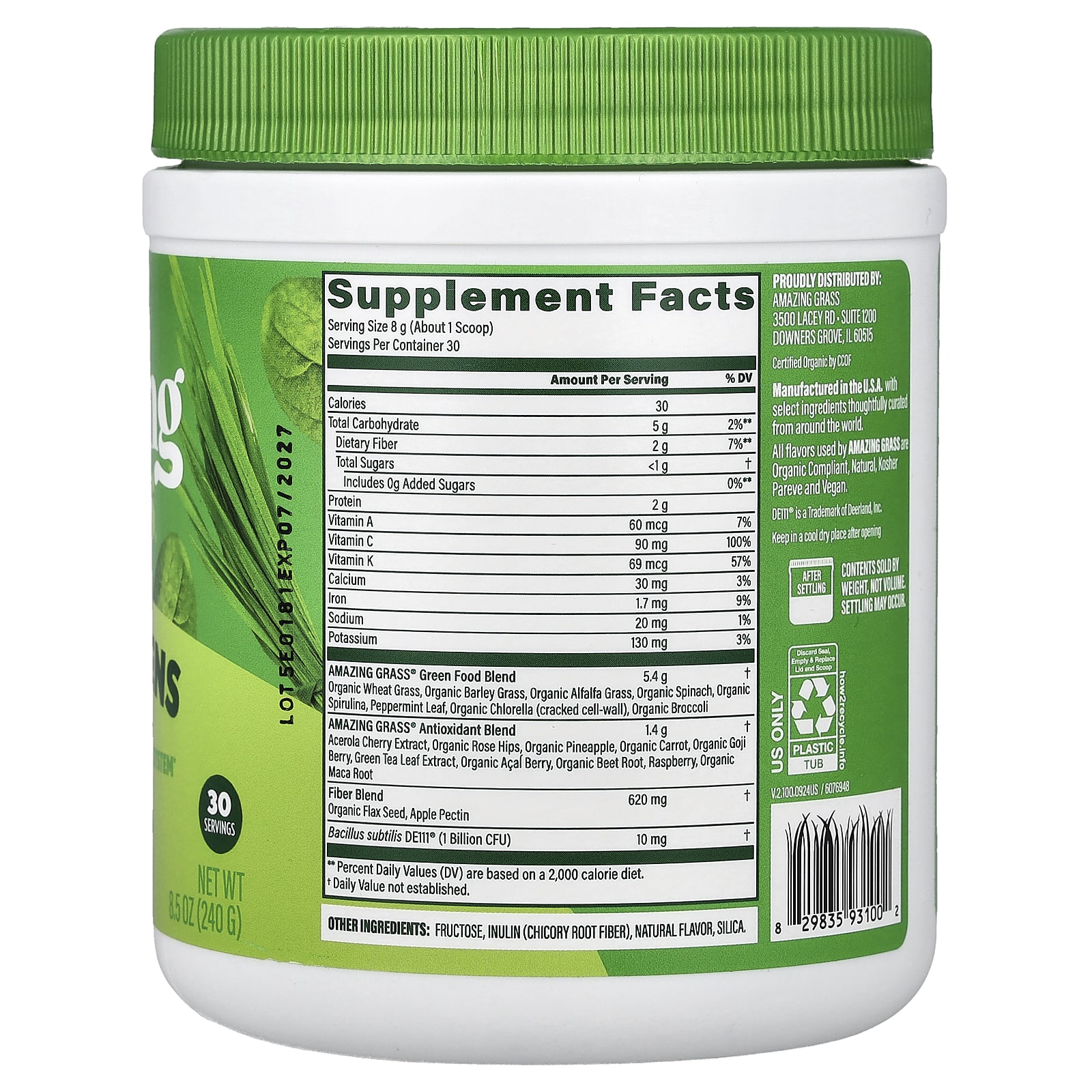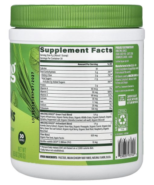 The OriginalSupports VitalitySupports ImmunitySupports Gut HealthDietary SupplementGluten FreeGreens Grown on US Family FarmsVeganNon GMOKosherCertified Organic by CCOF1 Billion CFU ProbioticsA Blend of 14 Greens, Fruits & Veggies100% DV of Vitamin CConvenient PowderThe Original Our most popular powder blend is an easy way to add more whole food nutrition to your health routine. Each great tasting scoop contains a blend of nutritious greens, fruits & veggies. It’s a simple way to support your overall health and wellness to help you feel amazing every day.Nutrition Made Easy.Wheat Grass Barley Grass AlfalfaSpirulina Chlorella Broccoli SpinachBeet Root Carrot PineappleAcai Berry Maca RootPlus: Acerola Cherry & More…Farm Family Roots Our roots run deep, back to a 3rd generation family farm in Kansas. Today, we continue to use organically grown, cereal grasses produced on U.S. family farms and craft them with high-quality plant-based ingredients from around the world.All flavors used by Amazing Grass are organic compliant, natural, kosher pareve and vegan.
