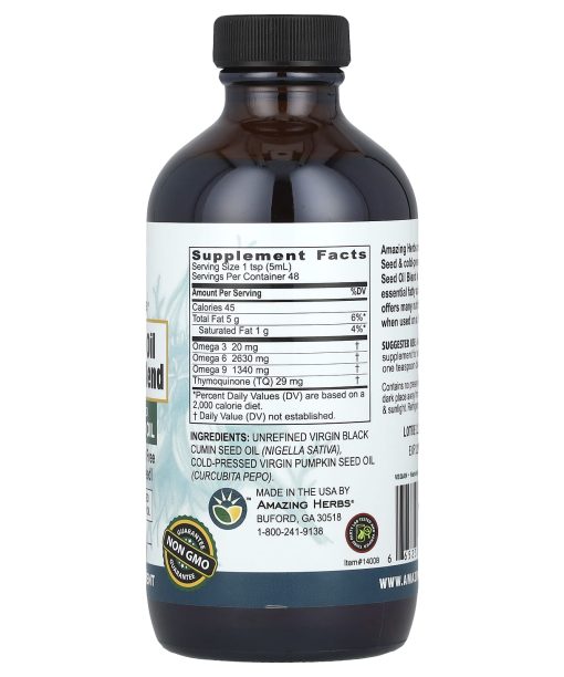 With Pure Cold-Pressed Pumpkin Seed OilSolvent Free Alcohol Free100% Pure Guaranteed!A Blend of Black Cumin Seed Oil And Pure Pumpkin Seed OilDietary SupplementNon GMO GuaranteeThird Party Lab Tested And Verified VeganNaturally Gluten FreeHalalContains No PreservativesAmazing Herbs cold-pressed Black Seed & cold-pressed Pumpkin Seed Oil Blend is a rich source of essential fatty acids (EFA’s) and offers many nutritional benefits when used on a daily basis.