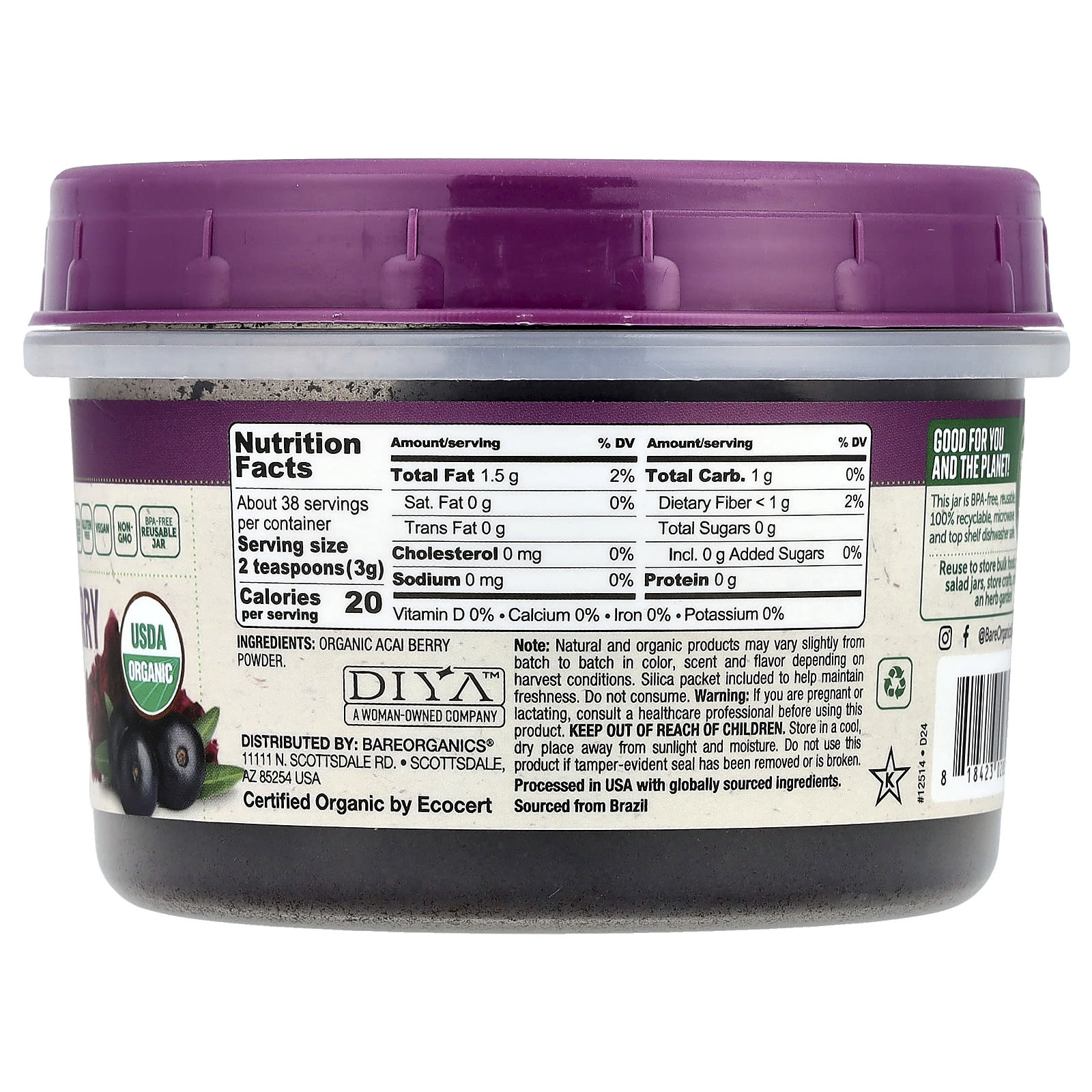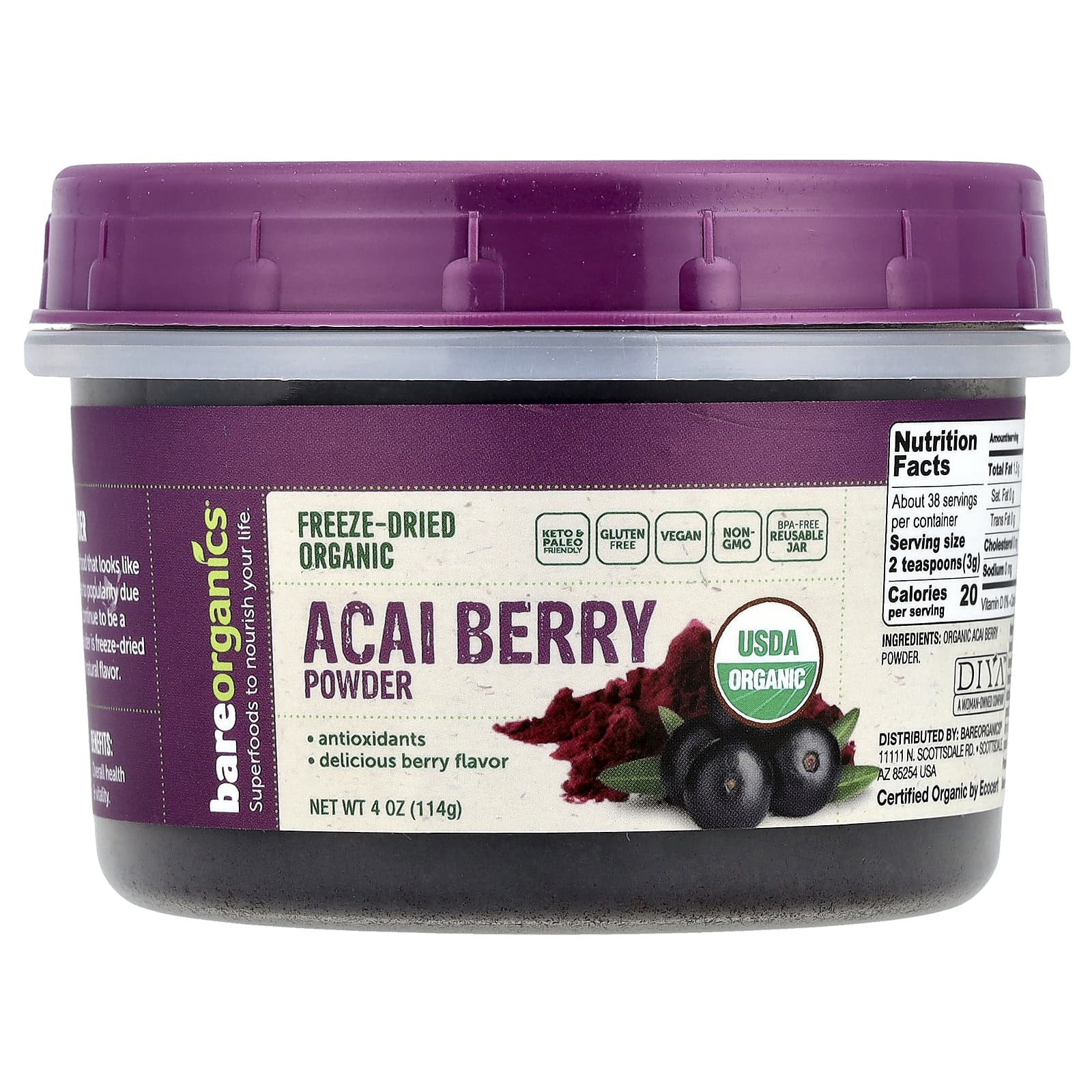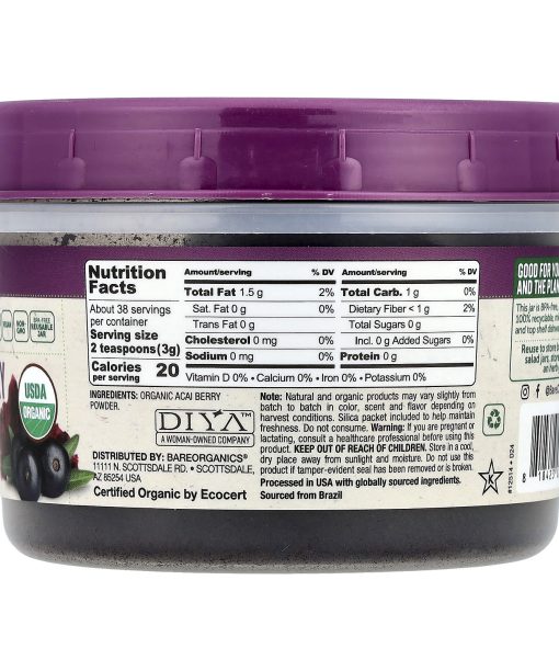 Superfoods to Nourish Your LifeKeto & Paleo FriendlyGluten FreeVeganNon-GMOBPA Free Reusable JarAntioxidantsDelicious Berry FlavorUSDA OrganicCertified Organic by EcoCertDIYA™ -A Woman Owned CompanyKosherBenefits: Overall Health & VitalityThe acai berry is a Brazilian superfood that looks like a dark purple blueberry. They rose to popularity due to their antioxidant content and continue to be a favorite today. Our acai berry powder is freeze-dried to help preserve its nutrients and natural flavor.  This jar is BPA free, reusable, 100% recyclable, microwave and top shelf dishwasher safe.